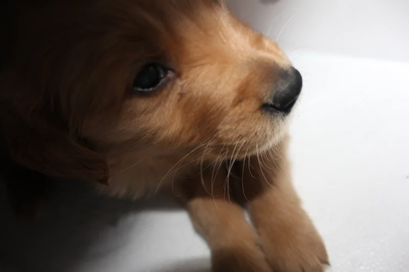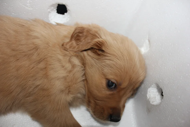 應版主活動,講述克里斯的故事,克里斯是我在他40多天的時候買下的,它媽媽生了12只我面對這一地的金毛瞬間慌了神,猶豫了好久也不知道該選哪一隻看起來哪一個都很可愛,就在我猶豫不決的時候我注意到了遠處有一隻很膽小不敢靠近人的狗狗,他看起來需要一個朋友,我決定就是他了。他到了傢就開始睡覺,但是我忽略了一件事,就是40日的齡的小狗還沒有斷奶,還是太早了,到了晚上他就開始嚎叫找媽媽要吃奶,吵得我根本無法入睡,我買了奶瓶奶嘴就像是照顧自己的孩子一樣每天給他喂奶,一點一點看著他長大。後來我發現他的膽子實在是太小了,他根本不敢離開自己的窩。 圖片是他四十日齡剛回到傢時拍攝的。