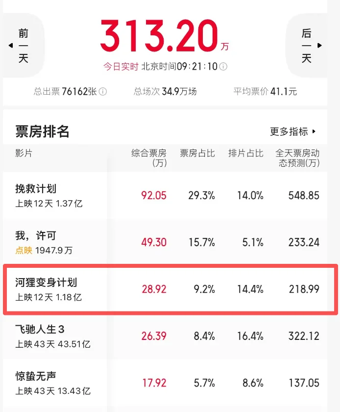 但有点感慨的是,该片上映了十几天了,到了现在别说和《挽救计划》相比了,昨天更是连第二名的成绩都没有守得住,更被点映的《我,许可》给超越了,成为了第四名。