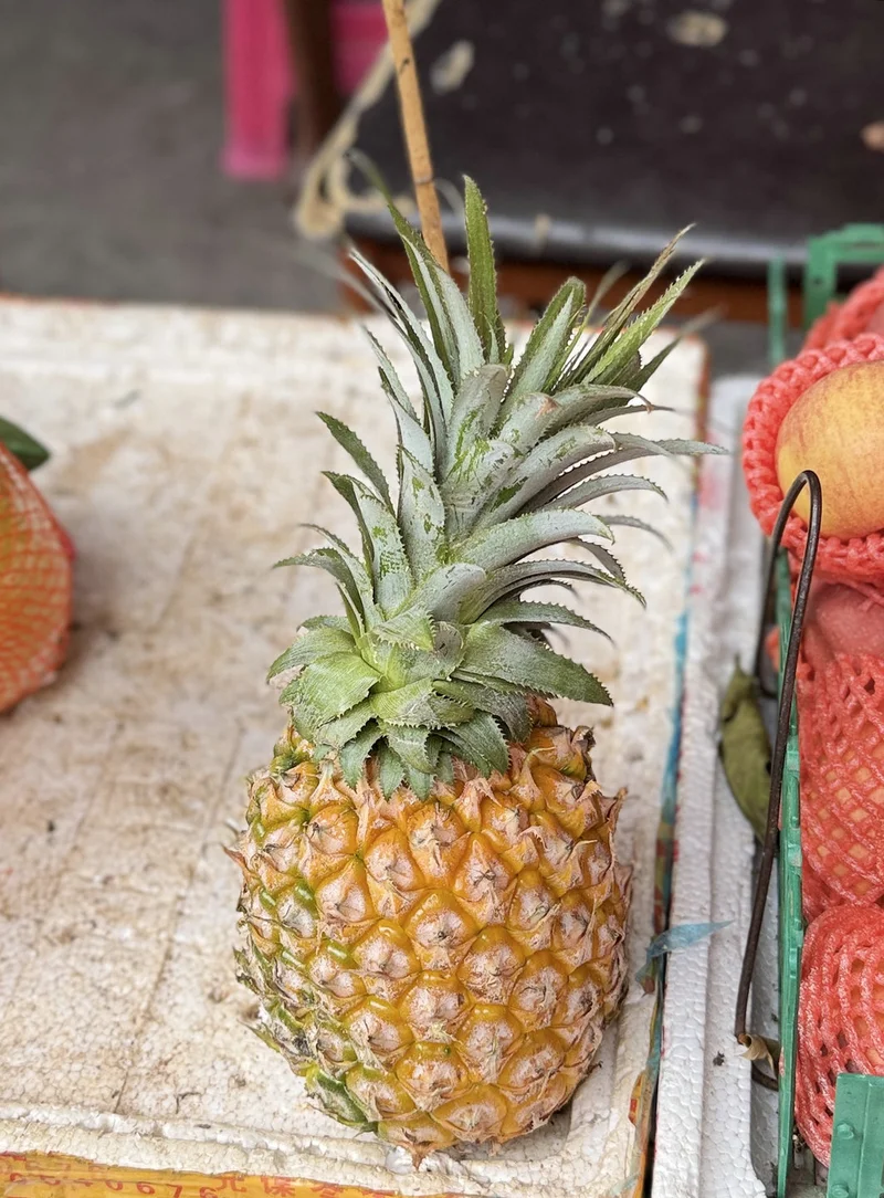 又路过一菜摊卖菠萝,叶边有锯齿的。