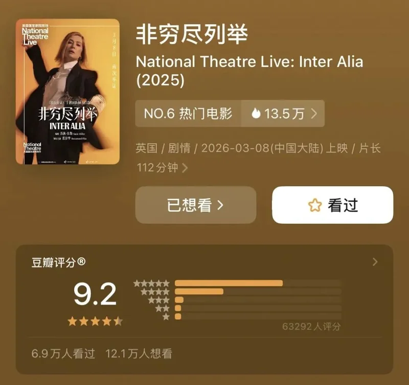 她主演的舞台剧《非穷尽列举》在中国上映后,成为26年开年以来豆瓣评分最高的电影。