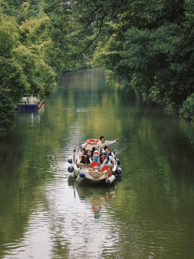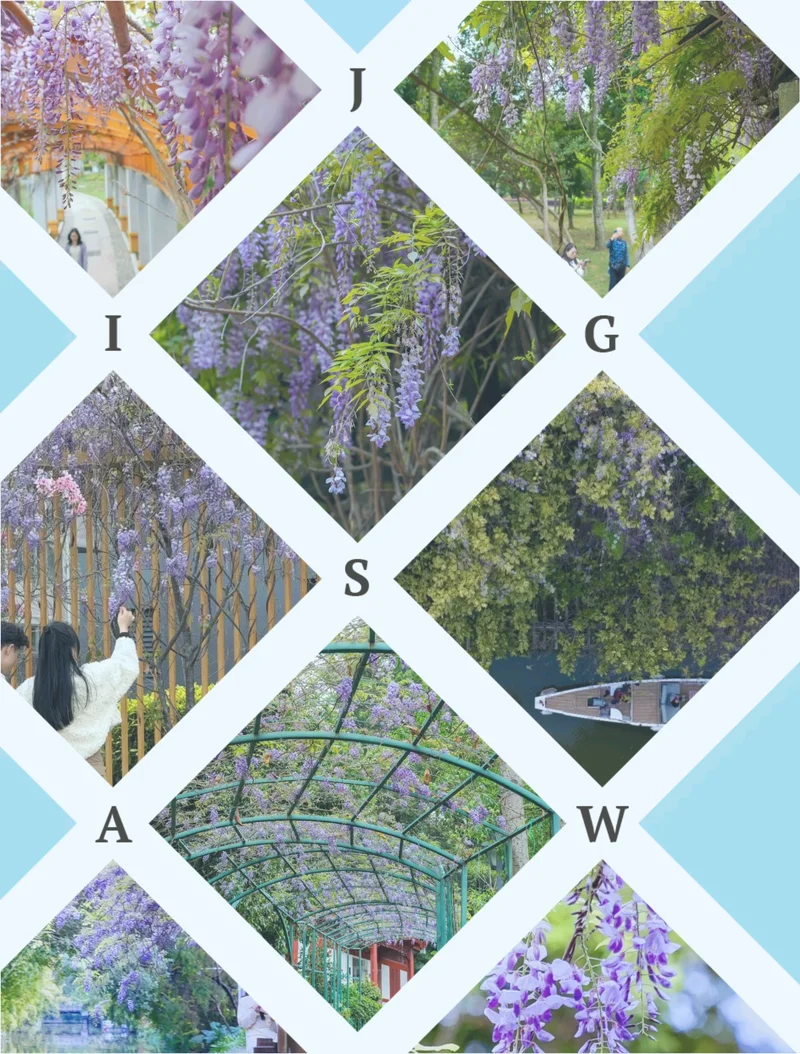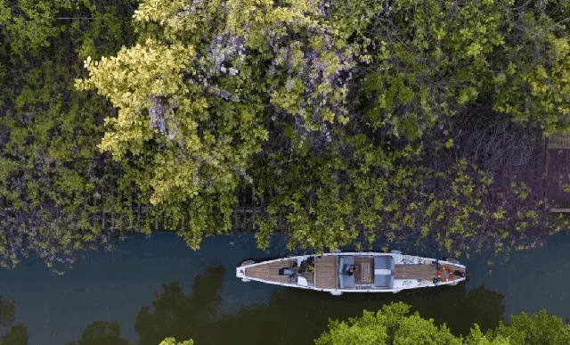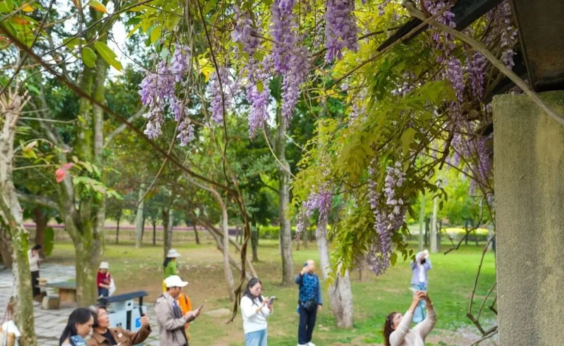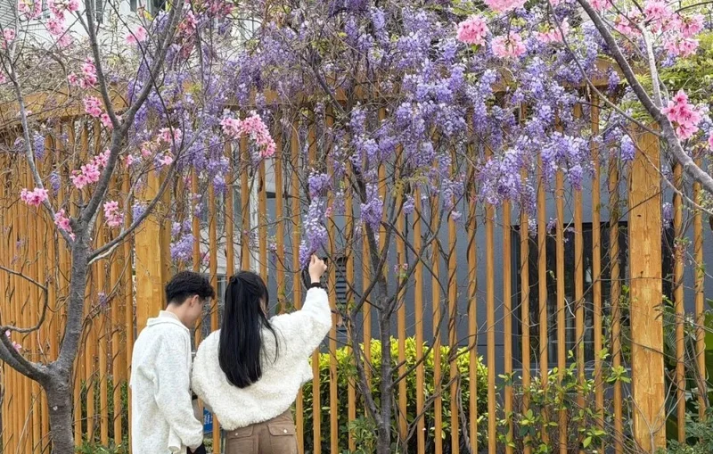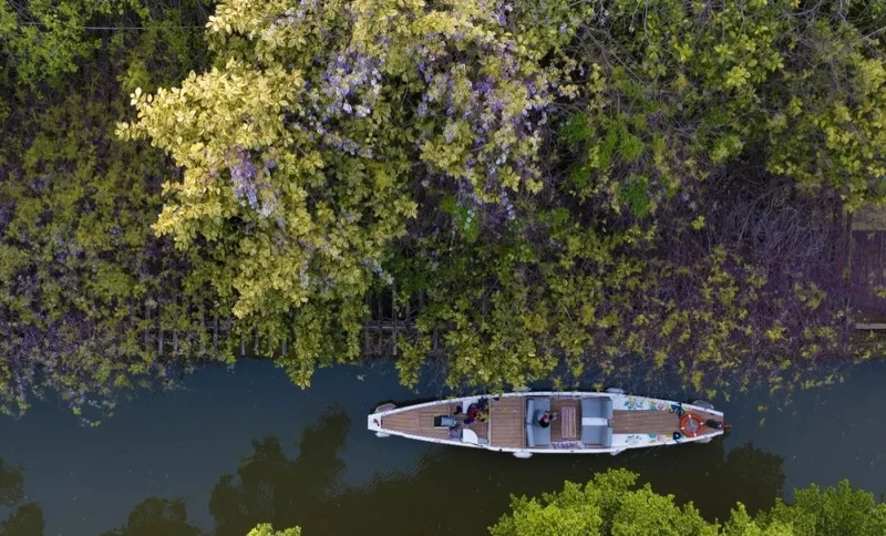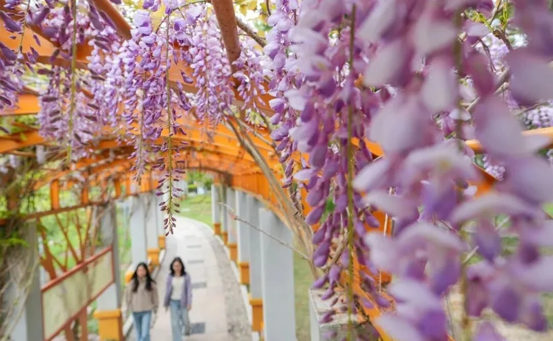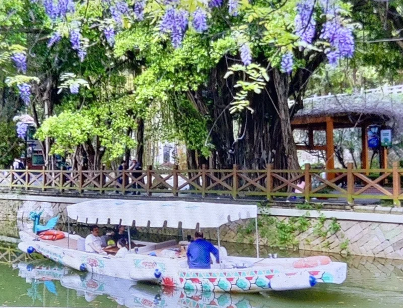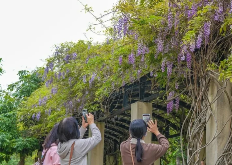 紫藤曼如瀑布般从两岸垂落, 与白马河游船、行人和景色构成极富诗意的『河上春意图』。