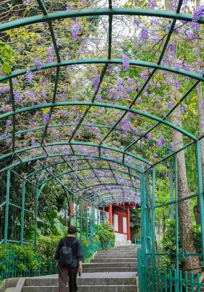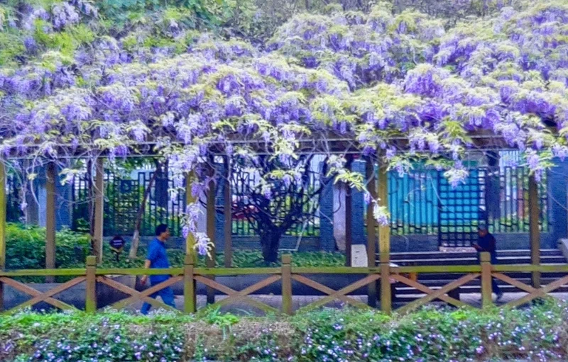 三、四月的福州白马河, 紫藤挂云木, 花曼宜阳春, 是紫藤的最佳观赏期, 紫藤花廓串连成一条紫色花带, 为福州春日增添一道浪漫的色彩。