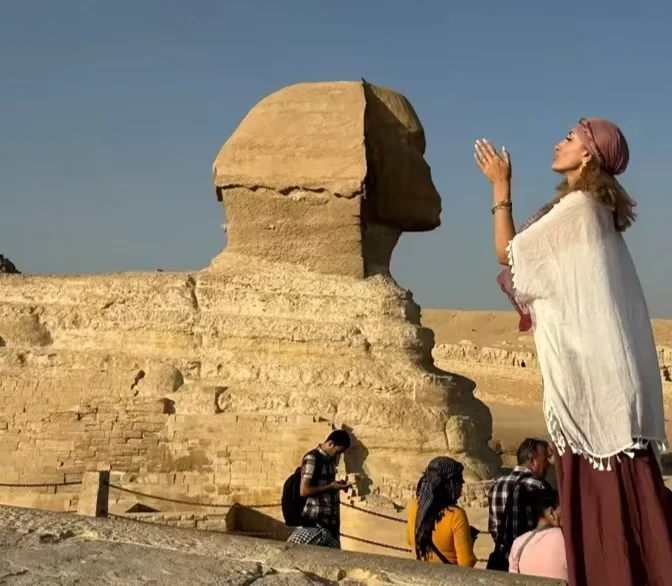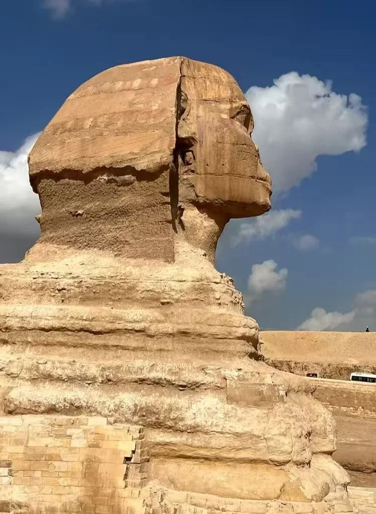 导游告诉我们,胡夫金字塔前面的狮身人面像原本是一块巨大石头,为了减少搬运,当时的建筑师想了个办法,将这块巨石参照哈夫拉法老的面容,雕刻成狮身人面样子,象征着王权与太阳神的威猛,被埃及人称为“地平线上的荷鲁斯”。