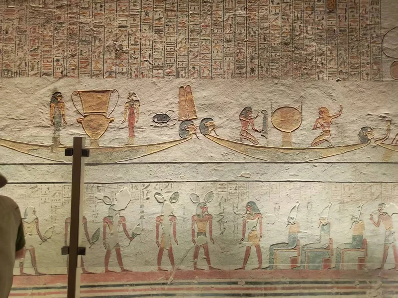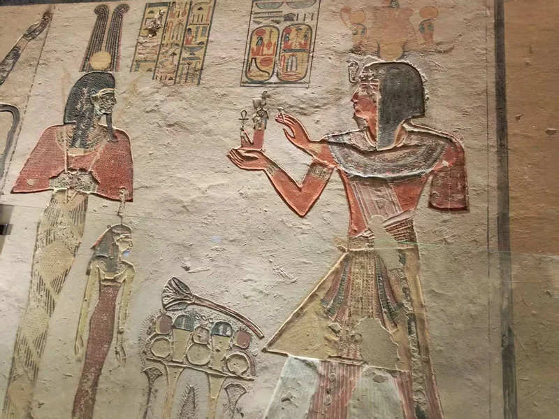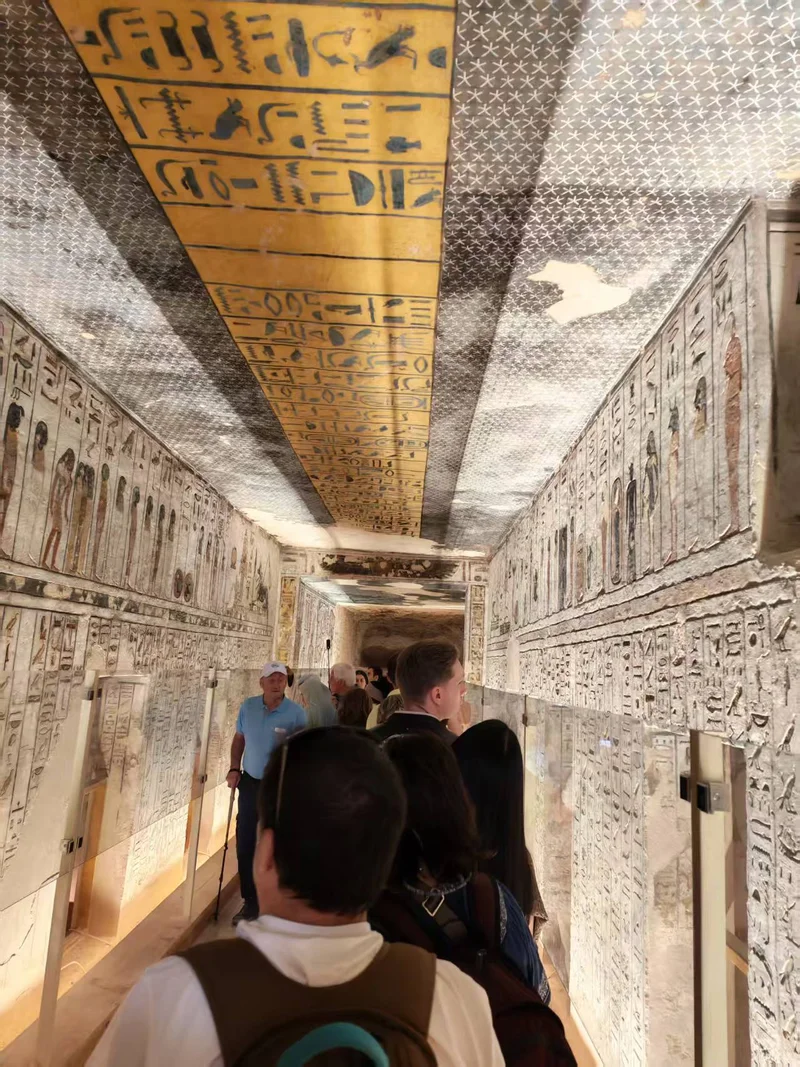 到了法老中后期,由于建造金字塔所费巨大,国力渐渐不逮,法老死后就比较集中地埋到了今天的帝王谷,帝王谷的陵墓跟中国古代墓葬一样很多都在早期被盗掘一空,留下了一些精美的壁画。然后被沙石掩埋,被人忘却在历史的尘埃里。直到百多年前一个牧童偶然发现,西方考古学家纷纷而来,掀起了埃及考古热。最惊人的发现是古埃及最年轻的法老图坦卡门(9岁即位19岁暴亡)墓,墓室很小却珍宝无数,5000多件藏品真的是炫人眼目,无法形容。