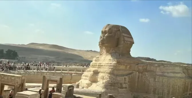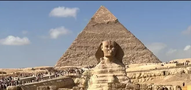 而埃及标志性的狮身人面雕像就端座在胡夫金字塔前。