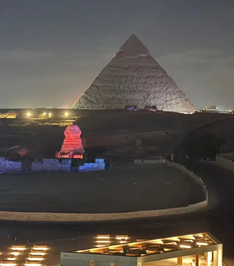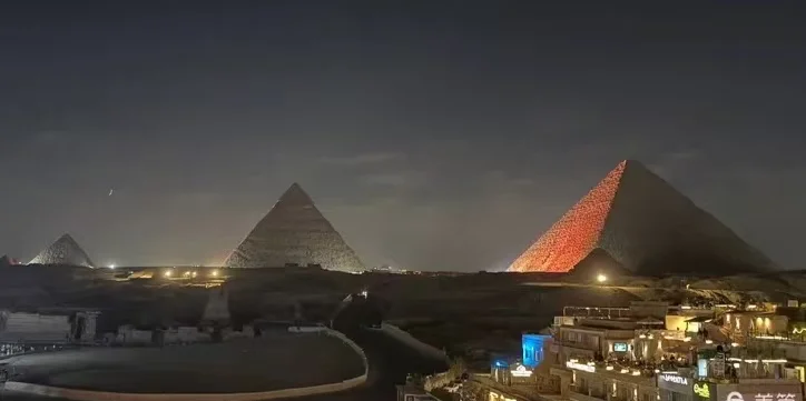 晚上胡夫大金字塔前有灯光秀,导游认为没必要现场观看,帮我们订了附近的餐厅,边吃边欣赏金字塔的夜景。