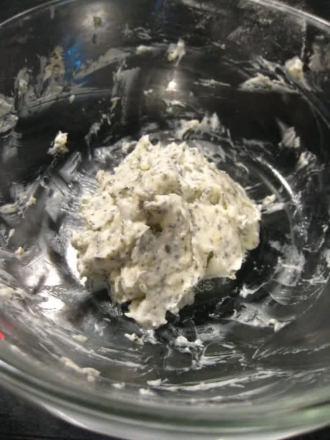 在面包发酵期间,你就可以着手做了,将无盐奶油打发,加糖粉10克,盐1/2茶匙,鲜奶1茶匙,干萝勒叶碎1茶匙,蒜茸两粒(研磨成茸),芝士粉1茶匙,再打均匀。参考图如下: