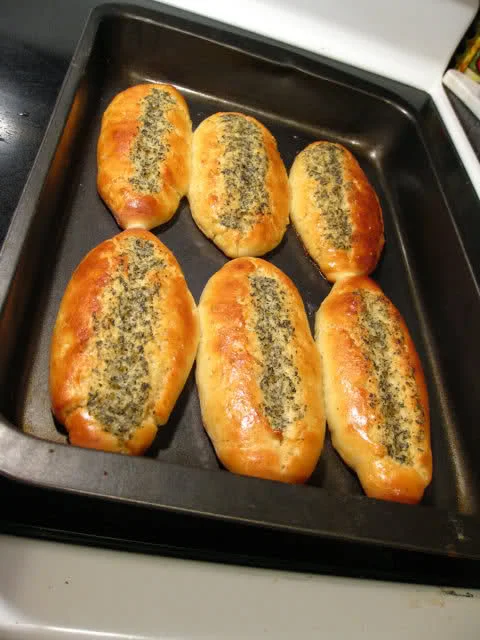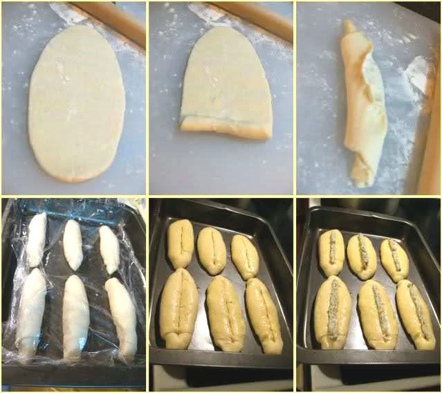六、将面团滚圆,再压成椭圆状,然后向内翻卷,卷成两头尖,中间鼓的形状,再盖上薄膜,醒30分钟。在面团表面纵向切一刀口深0.6-0.8cm左右,发酵10分钟,再均匀地刷上蛋液,在刀口处挤入搅拌好的C配料;