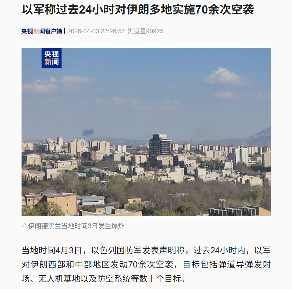 当地时间4月3日,以色列国防军发表声明称,过去24小时内,以军对伊朗西部和中部地区发动70余次空袭,目标包括弹道导弹发射场、无人机基地以及防空系统等数十个目标。