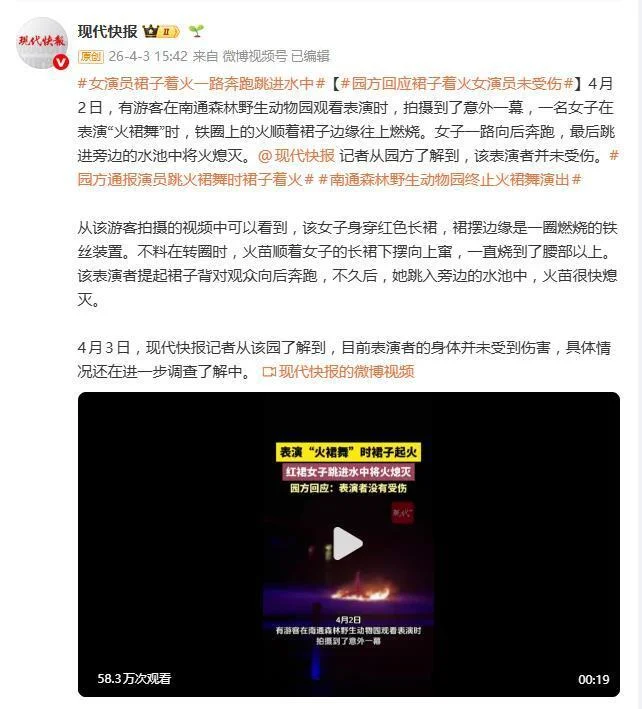 面对舆论关切,园方在4月3日给出了回应。南通森林野生动物园的客服向记者确认,演出女子的身体状况目前没有问题。对于事故的具体原因和细节,他们表示还在向演艺部门进一步了解,并将通过相关渠道公布。