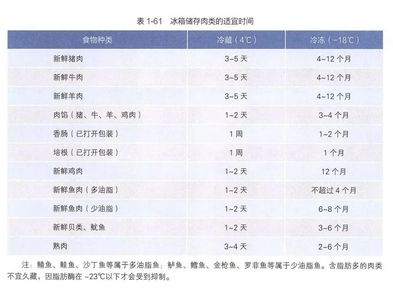 根据《中国居民膳食指南》,在保持-18℃的冷冻情况下,禽畜类冷冻肉的大致保质期为4~12个月,水产类冷冻肉的大致保质期为2~8个月。