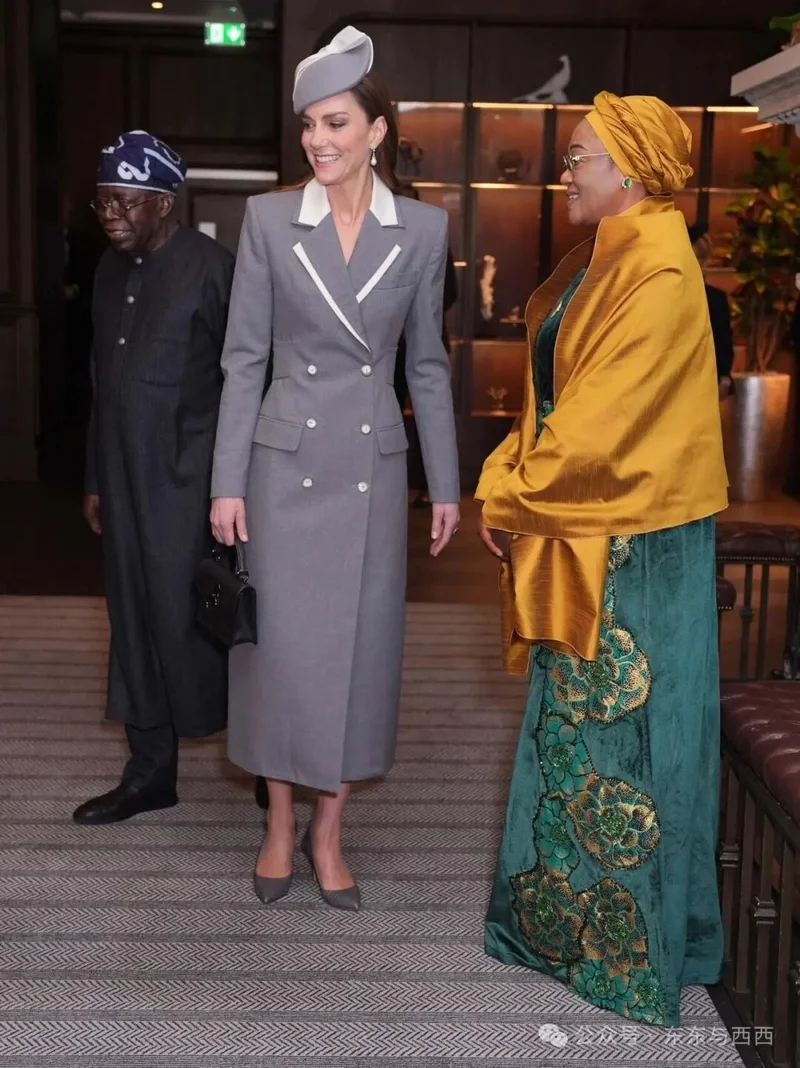 接待尼日利亚总统和夫人访问,穿英籍尼日利亚设计师Tolu Coke灰色白翻领大衣裙,佩戴戴安娜珍珠耳环,被誉“外交着装典范”↓↓