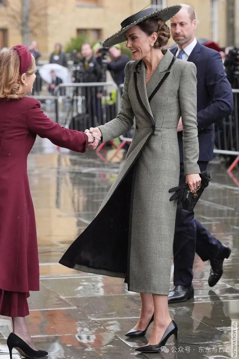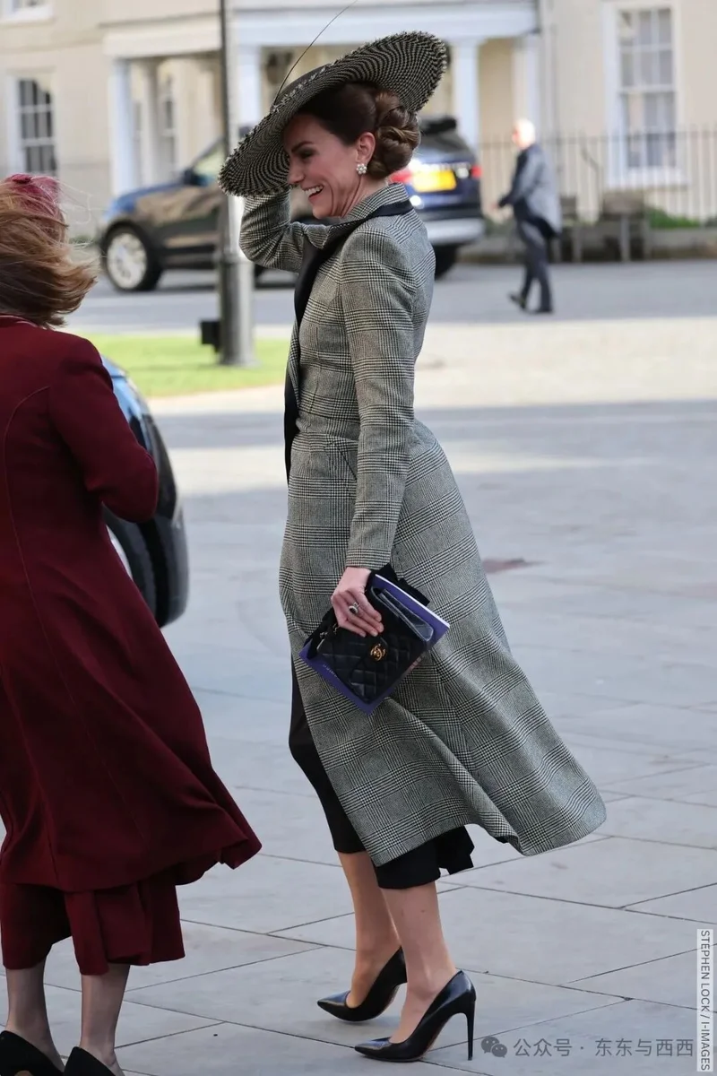 穿衣是一贯的大衣裙,网友觉得呆板,重点是优雅不出错。Suzannah London威尔士格纹黑条双排扣大衣,搭配Jane Taylor帽饰↓↓