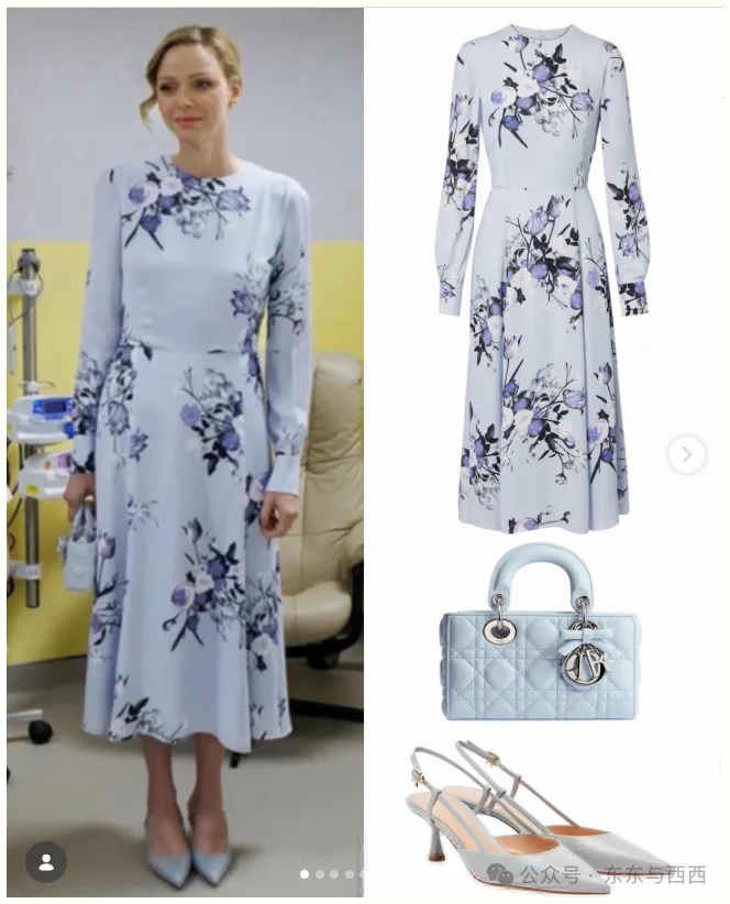 到儿童医院慰问,穿英国品牌Erdem蓝底印花连衣裙,同色高跟鞋和迪奥戴妃包,春日look好温柔↓↓
