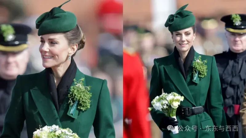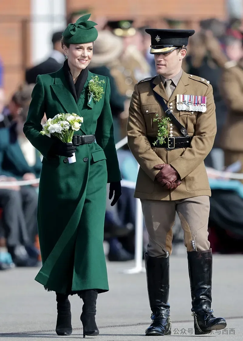 凯特担任爱尔兰卫队荣誉上校,每年出席爱尔兰传统节日——圣帕特里克节活动,都选择一件剪裁利落的绿色大衣和帽饰搭配三叶草胸针。