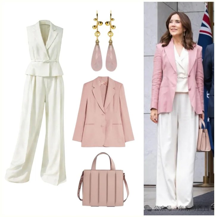 Max Mara粉色亚麻外套,内搭同品牌白色无袖裤装↓↓