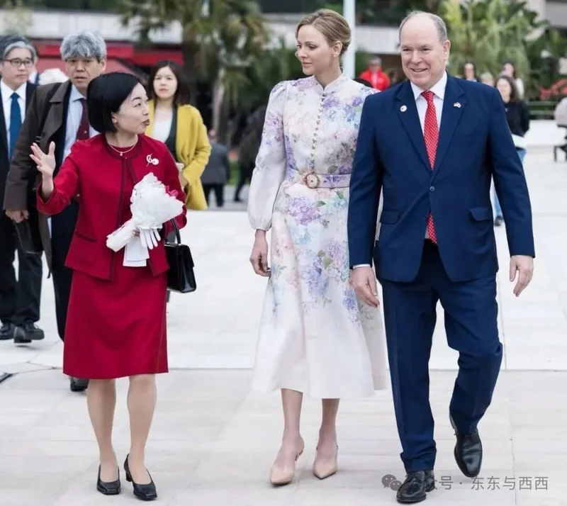 在摩纳哥与日本建交纪念仪式上,夏琳穿Zimmermann绣球花排扣长裙,贴心地只穿了中跟鞋,三笠宫彬子一身红裙↓↓