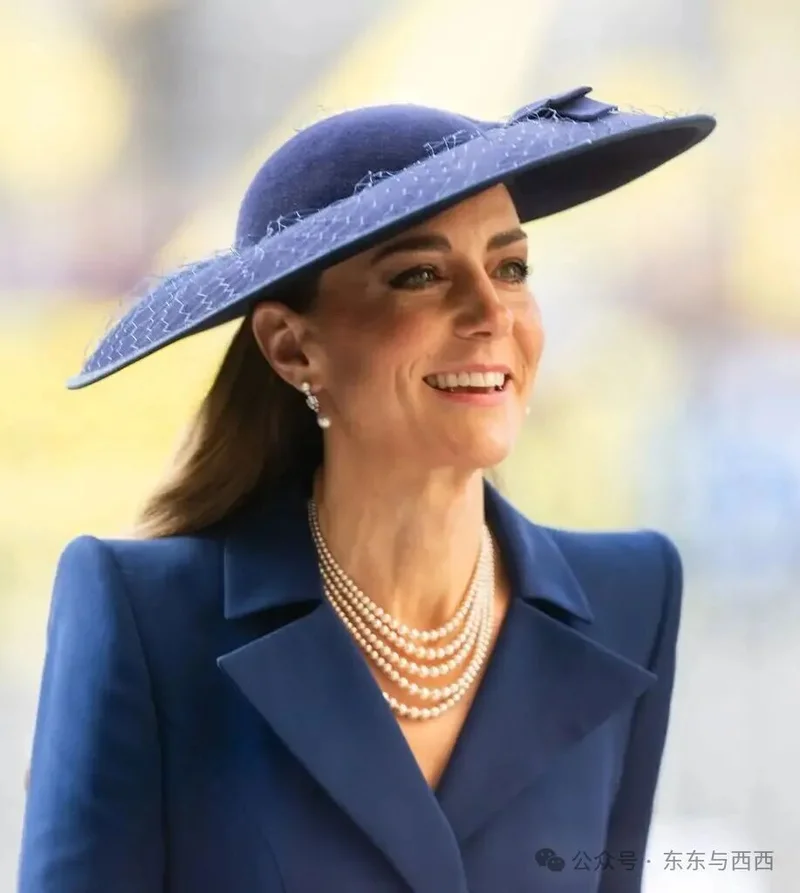 3月初,出席联邦日活动穿Catherine Walker复古蓝百褶大衣裙搭配Sean Barrett碟状帽。瘦成纸片人,但看着很精神↓↓