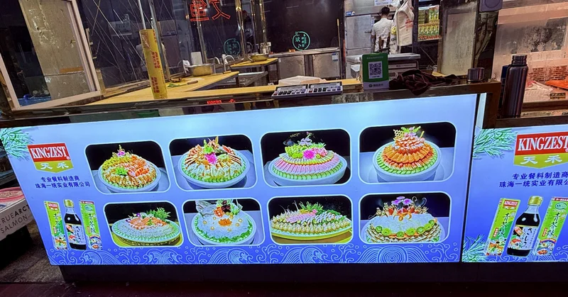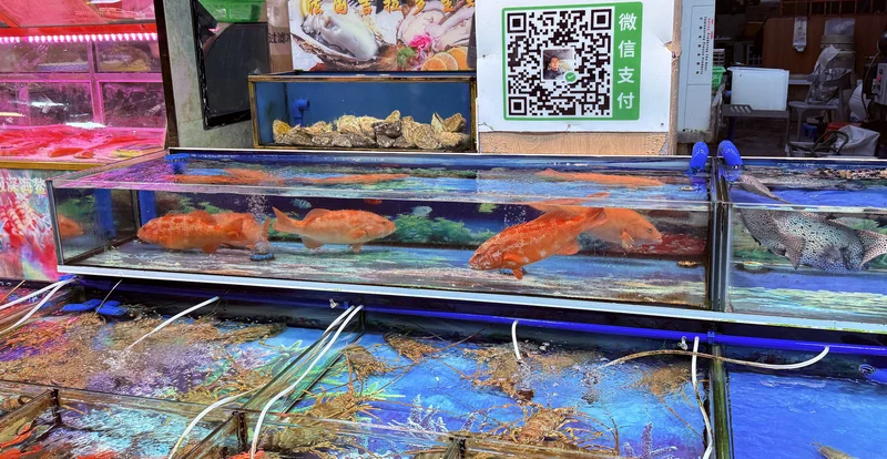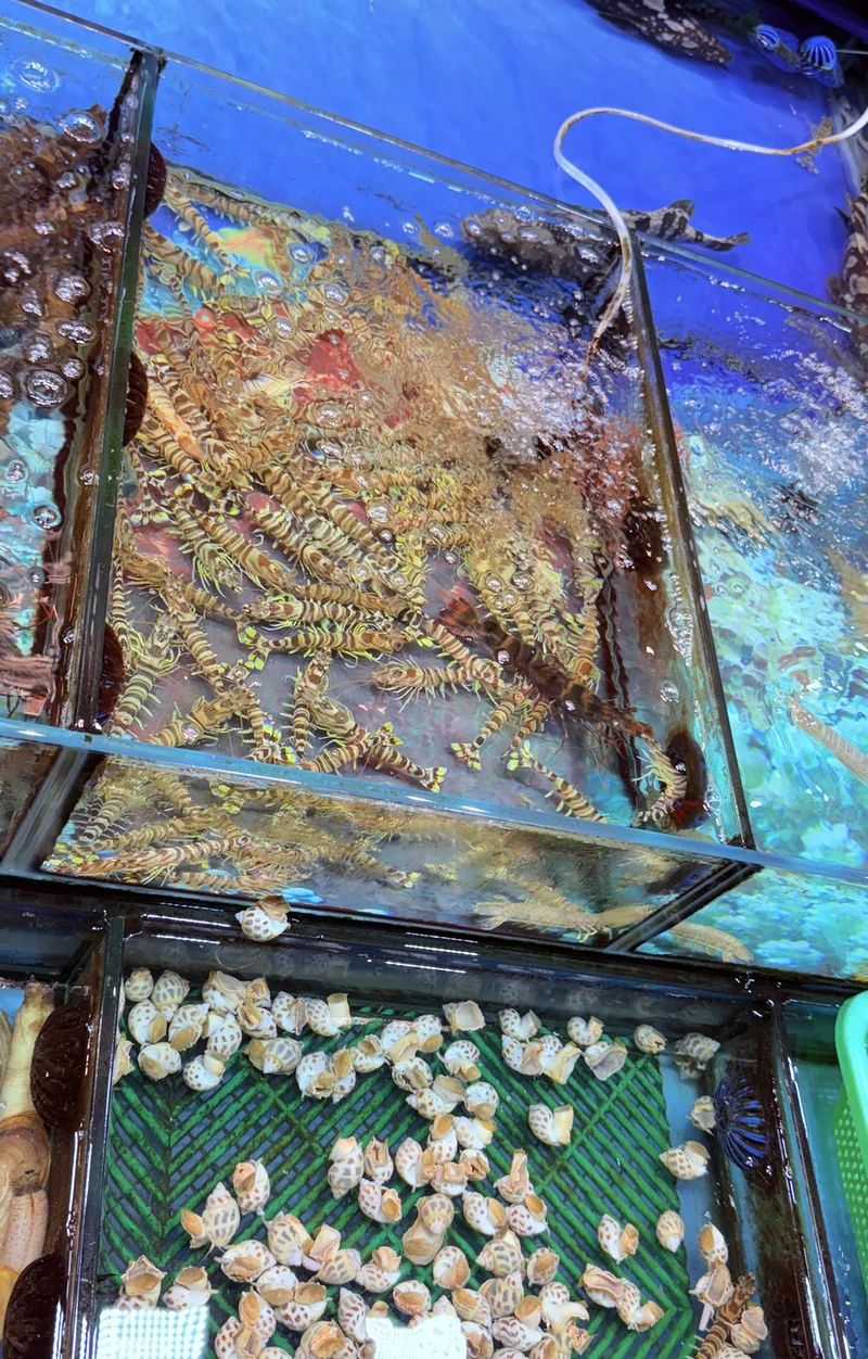 广州渔人码头的水产市场核心是 五湖四海水产世界(也叫五湖四海水产街),是番禺地区主打 “现买现加工” 的热门海鲜集散地。在番禺区洛溪新城,它的优势是统一称重、统一计价、统一打包,足斤足两,环境较传统市场更干净整洁。我们挑了些鱼虾蟹后去附近的餐厅加工,另贴介绍。