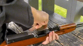 56式半自动步枪射击时,枪机“哐当”一声后坐复进,弹壳高高抛向右上方。