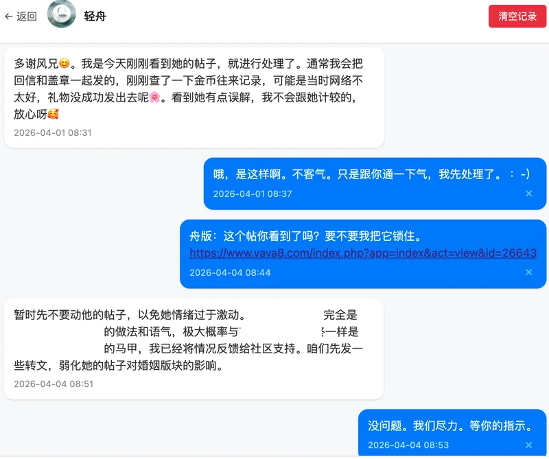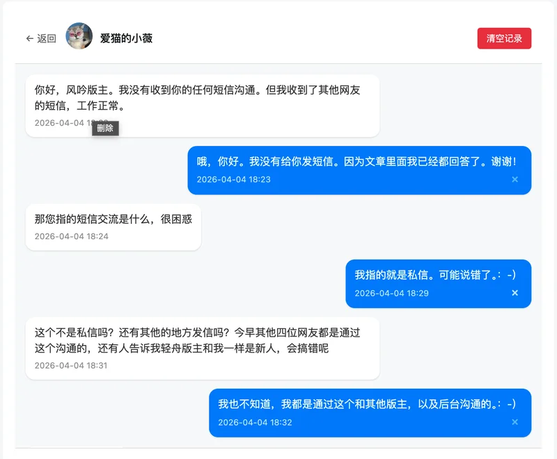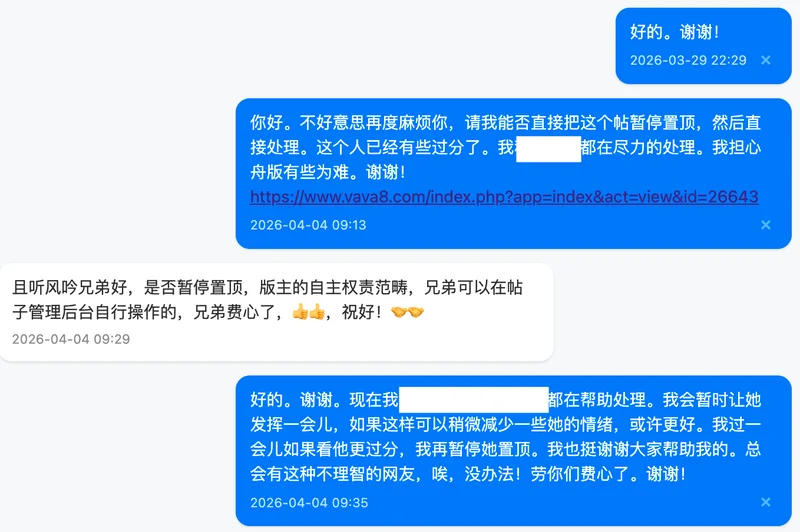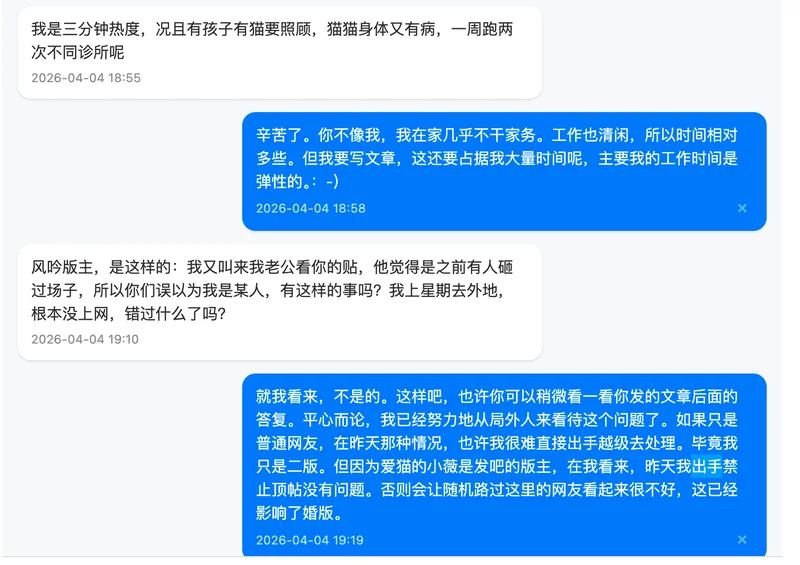 2. 下面这份往来交流,是我昨天准备限制你帖子置顶之前的内容。我之前已经把你另外的帖子禁止了,还删除了几个回复(我记得那里面好像不是“爱猫的小薇”这个网名发的,我当时觉得那些回复写得不太合适。对不起,我忘了具体名字了)。特别说明一下,这份交流中有我私下的评价,我非常遗憾,我不是故意的。那些话只是我在内部沟通时为了方便描述问题而简单写的,我本没有必要公开出来。