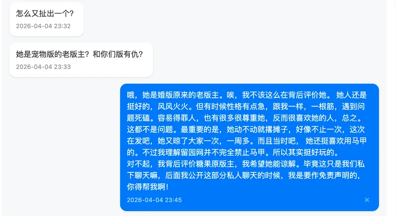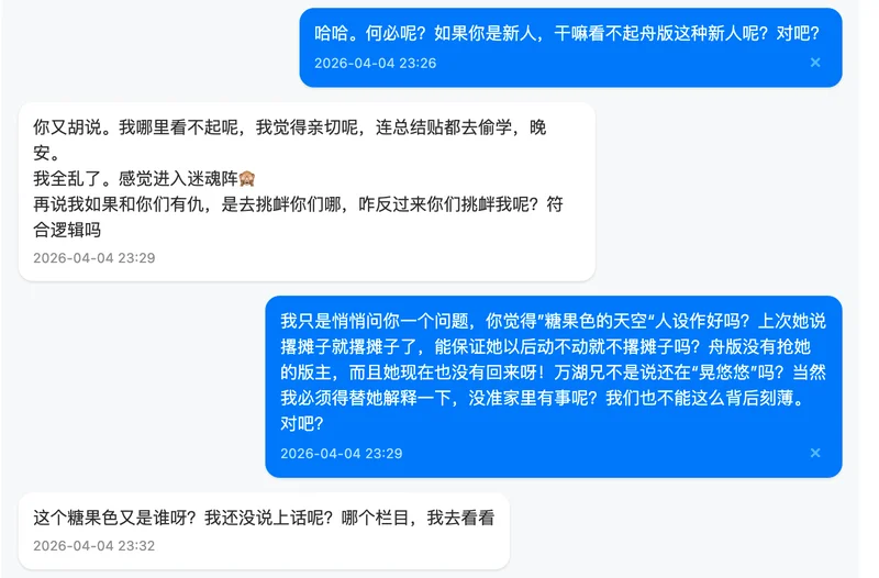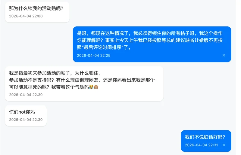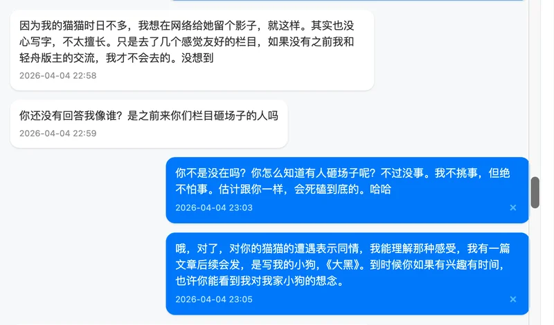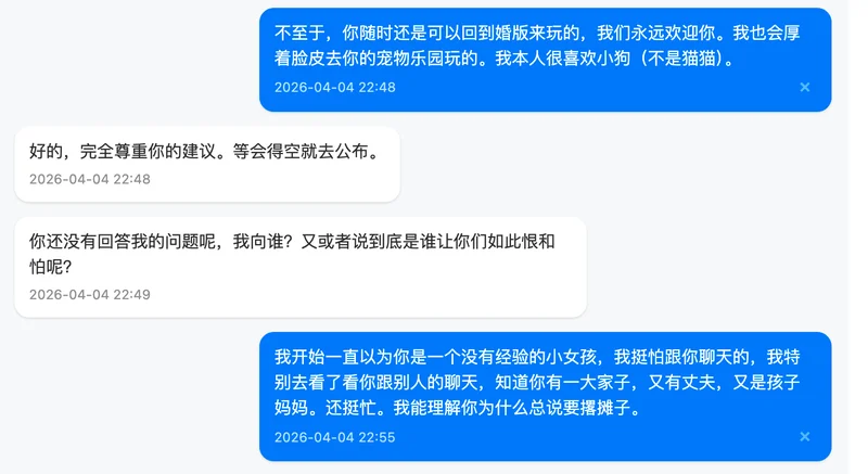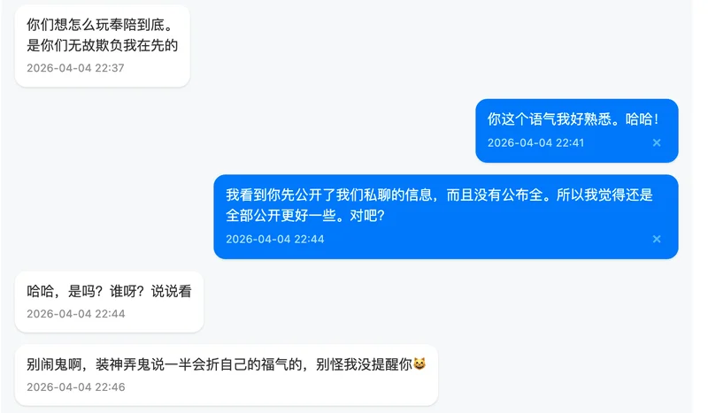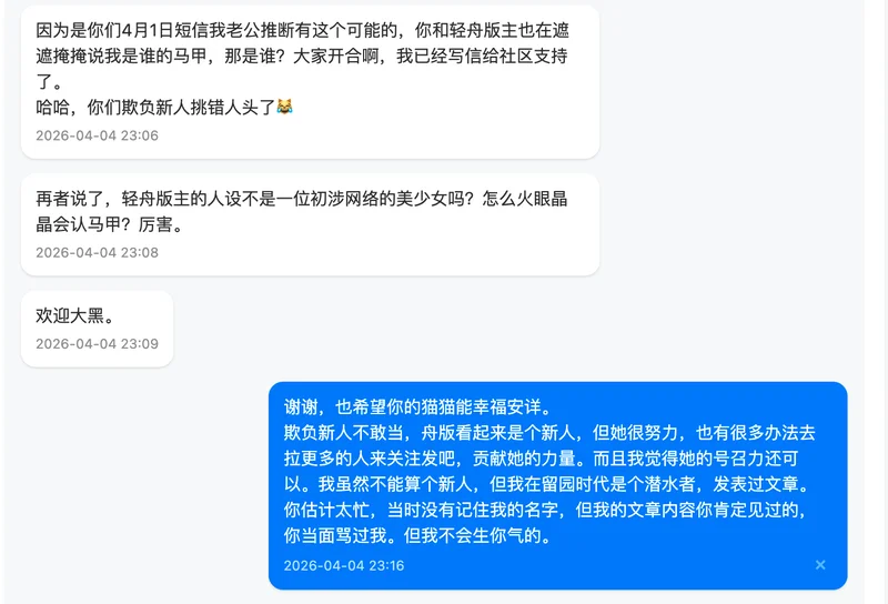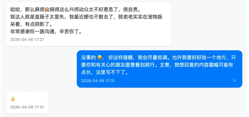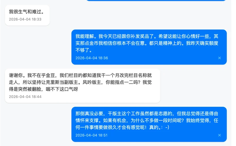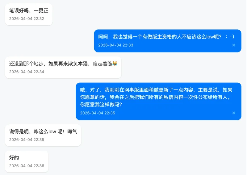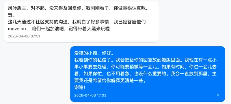 最后,关于我对这件事的整体看法,我在私信里其实也跟你提到过。坦率地说,我个人不太认同中途不交代一下就离开的做法。这无关具体是谁,而是我自己一贯的处事原则。无论做什么,我觉得善始善终是一种基本的责任,多次随意撂摊子的人没有资格谈是否胜任。当然,每个人都有自己的难处和选择,我无意评判任何人。我只是想把自己的真实想法说清楚,不想拐弯抹角。希望你能理解我的立场,也完全尊重你有不同的看法。我们求同存异就好。