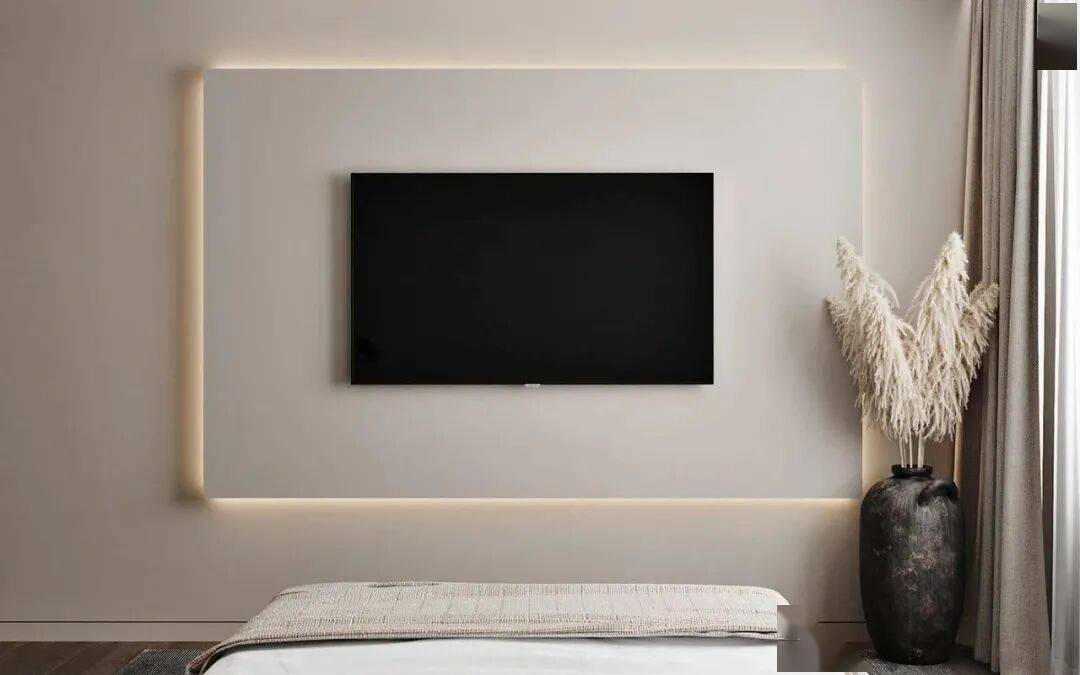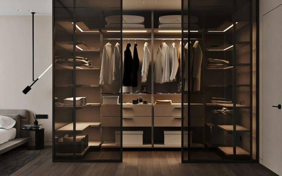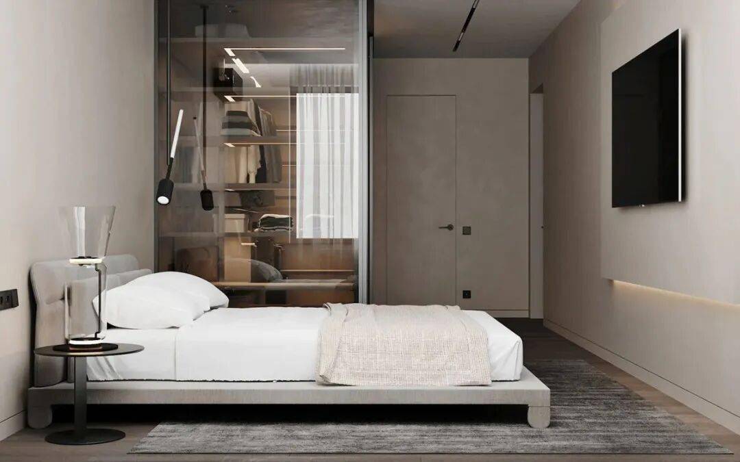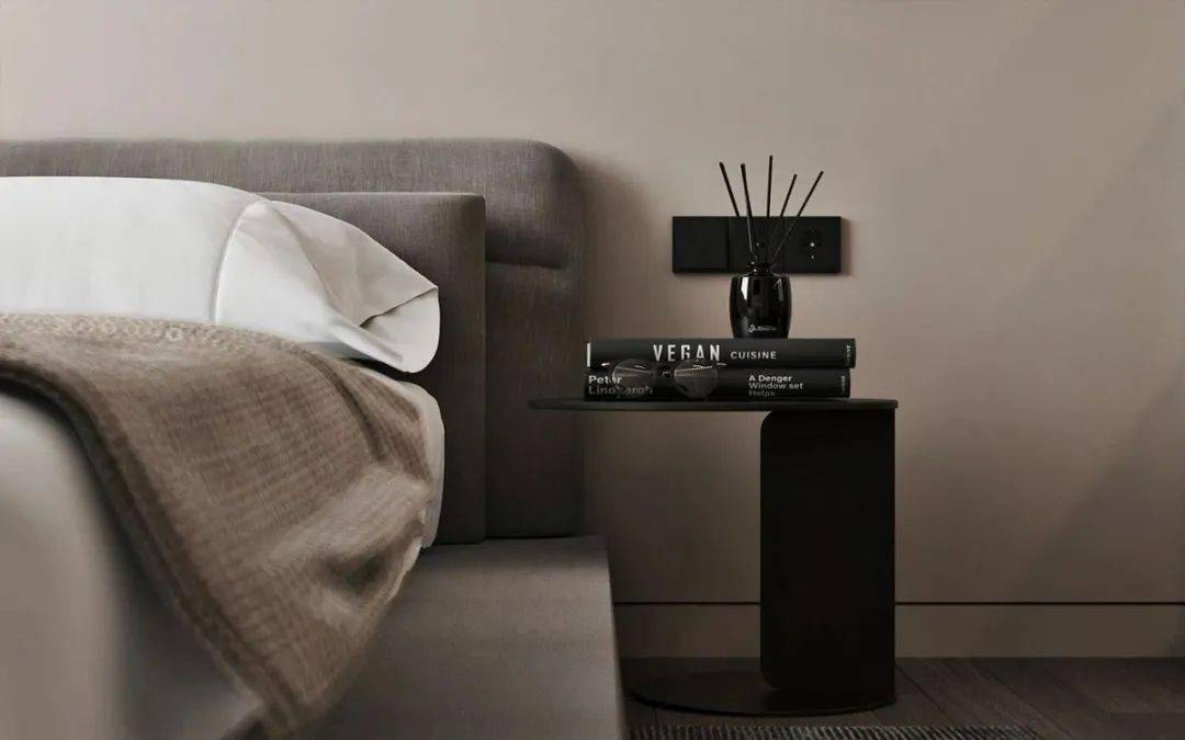 主卧中以白色作为空间的主色调,白色的床品搭配深色的地毯,十分有格调。散发暖光的电视墙与一旁的装饰植物搭配,为空间增添暖意,凸显出精致优雅的气质。造型独特的床头柜小巧而精致,富有设计感。衣帽间为主人量身定制,用深色玻璃进行分割。