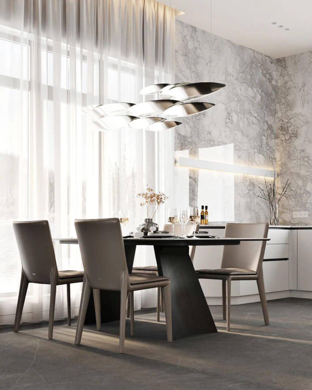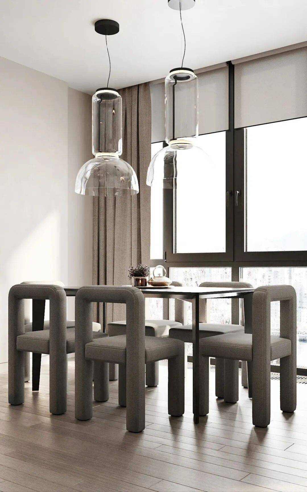 餐厅依旧使用高级灰与木色作为主色调,极具线条感的餐桌与餐椅,展现了极简主义下的几何美感。餐桌上方的玻璃吊灯造型独特,宛如两个倒扣的玻璃瓶。餐桌位于窗前,保证了用餐时有充足的光线,也便于欣赏屋外的风景。