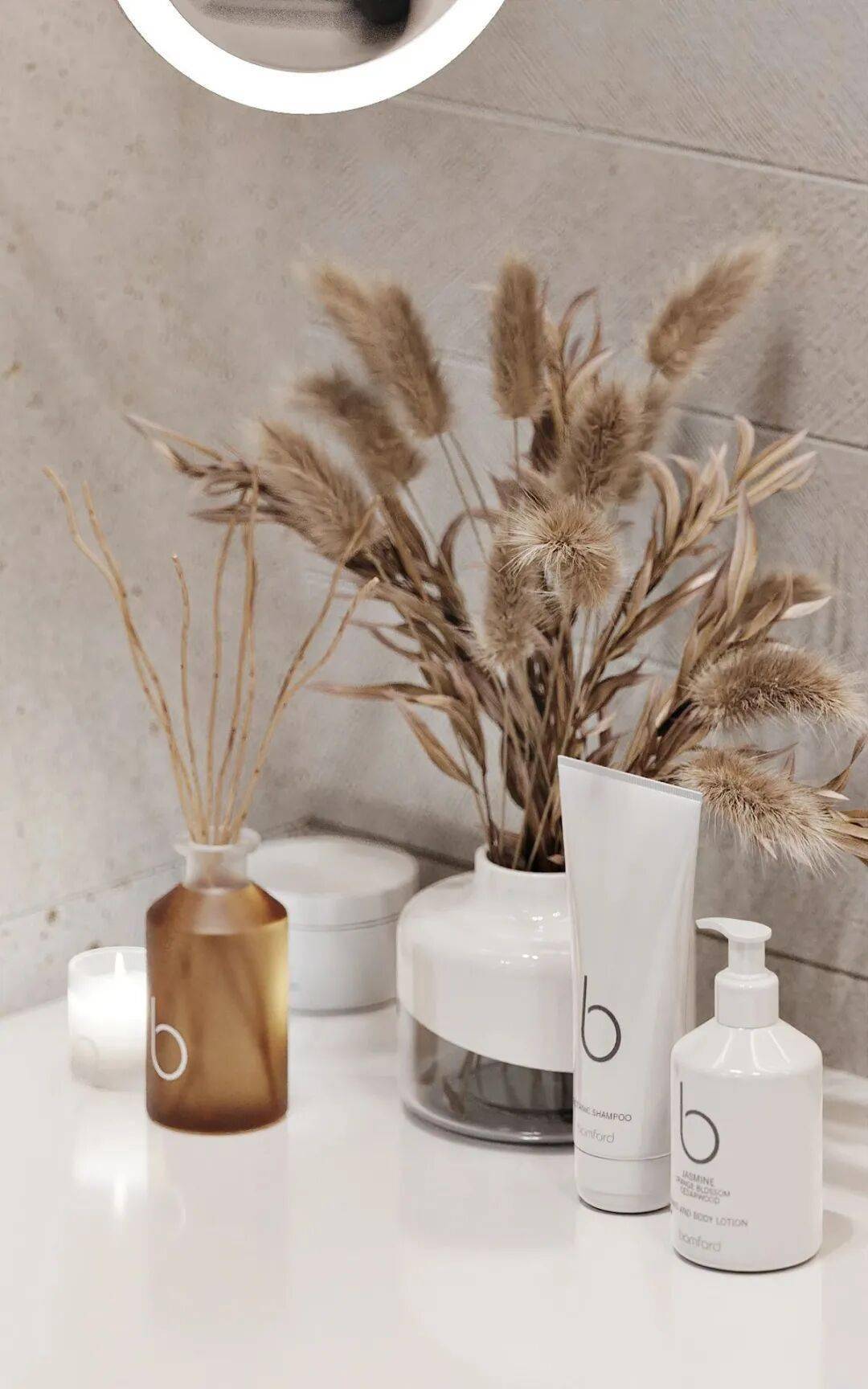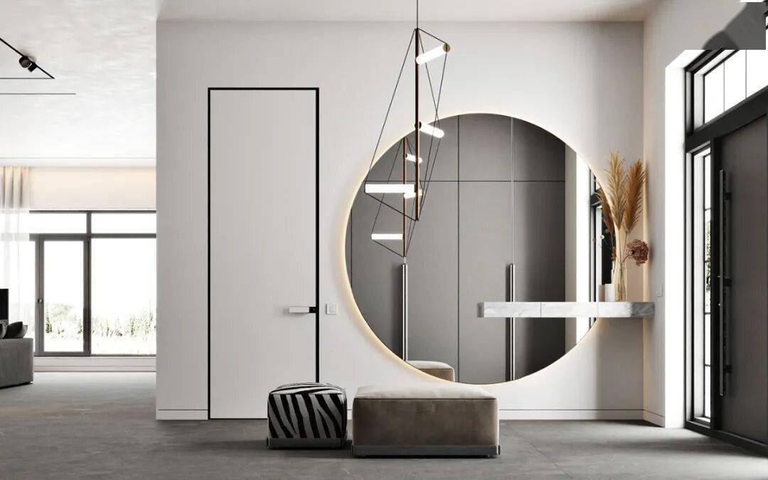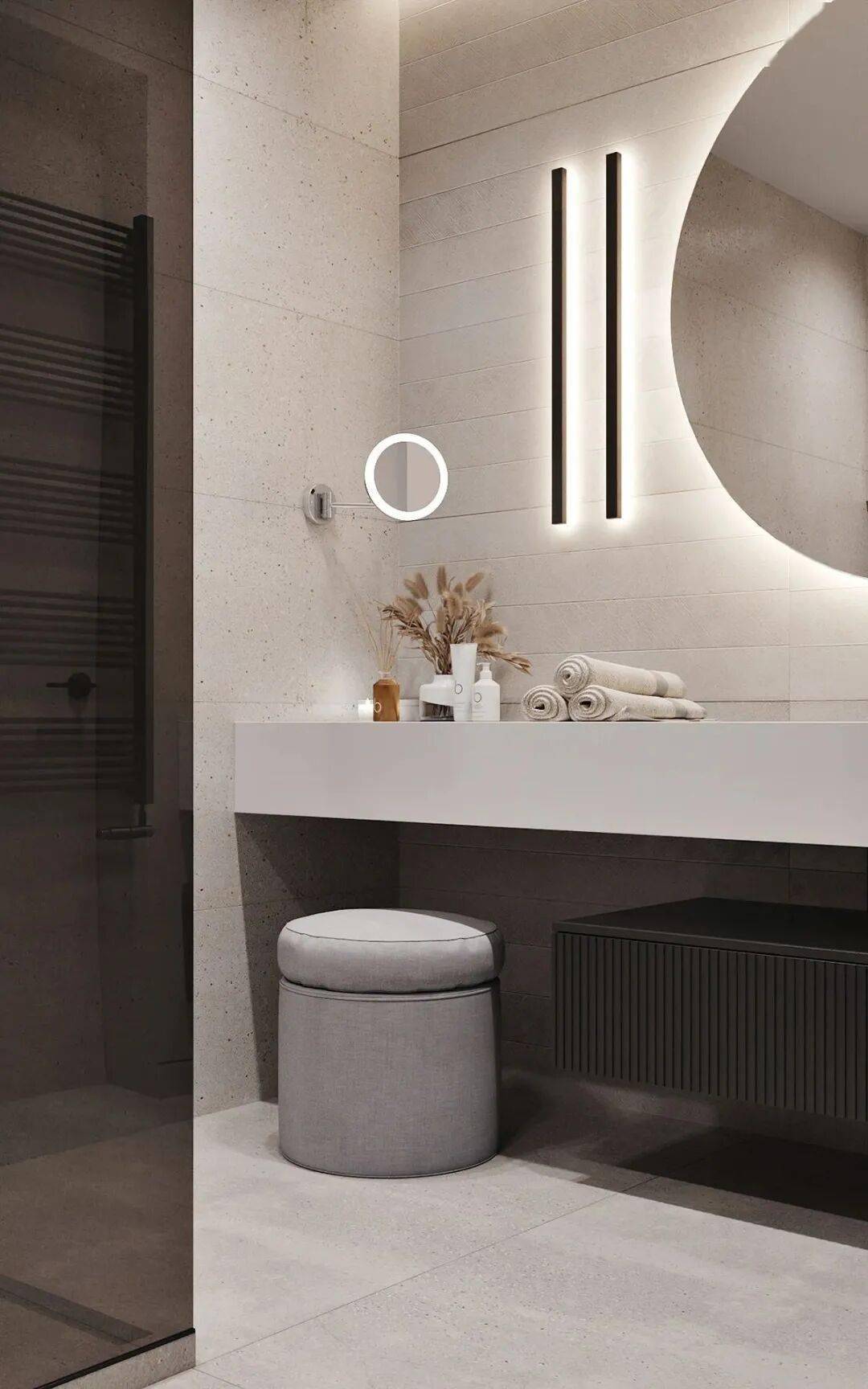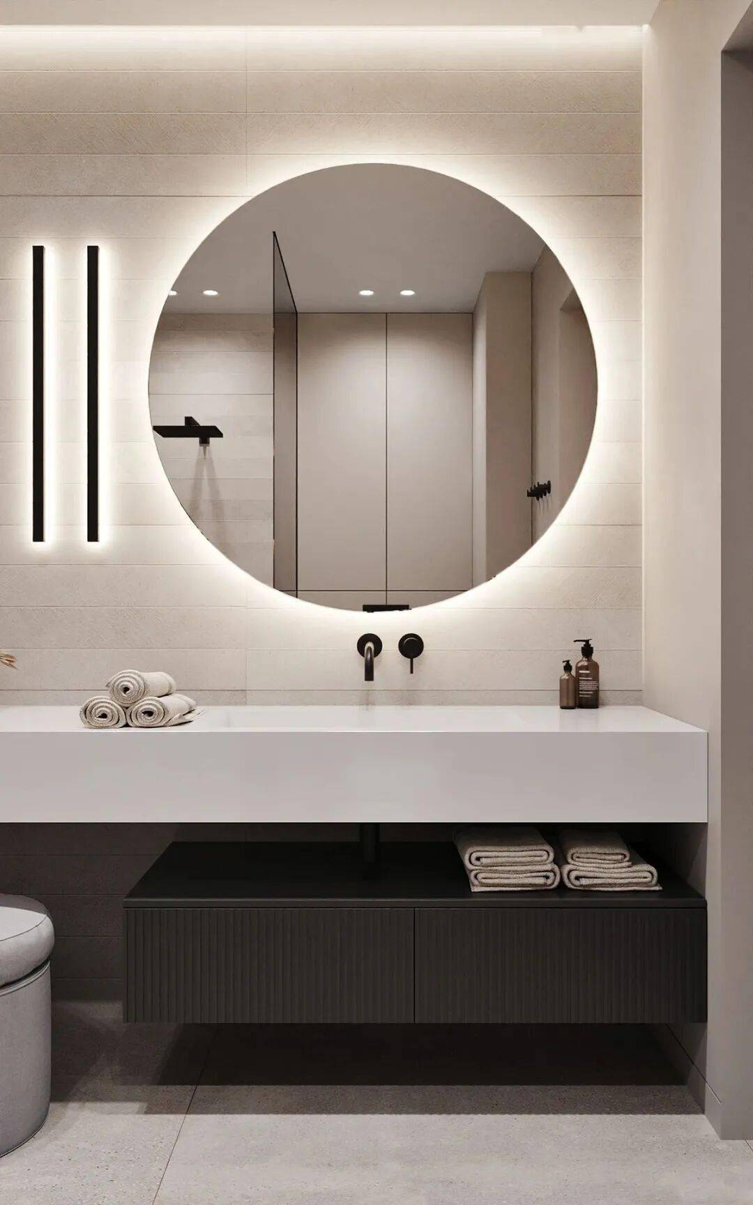 卫生间中光线充足,呈现出干净舒适的空间氛围。圆形镜面搭配黑色哑光线条,十分具有构成感,镜面后方的白色灯光,在墙面上留下光晕。黑白配色的洗手台设计精致,总体氛围充满格调。