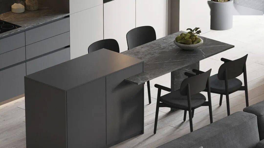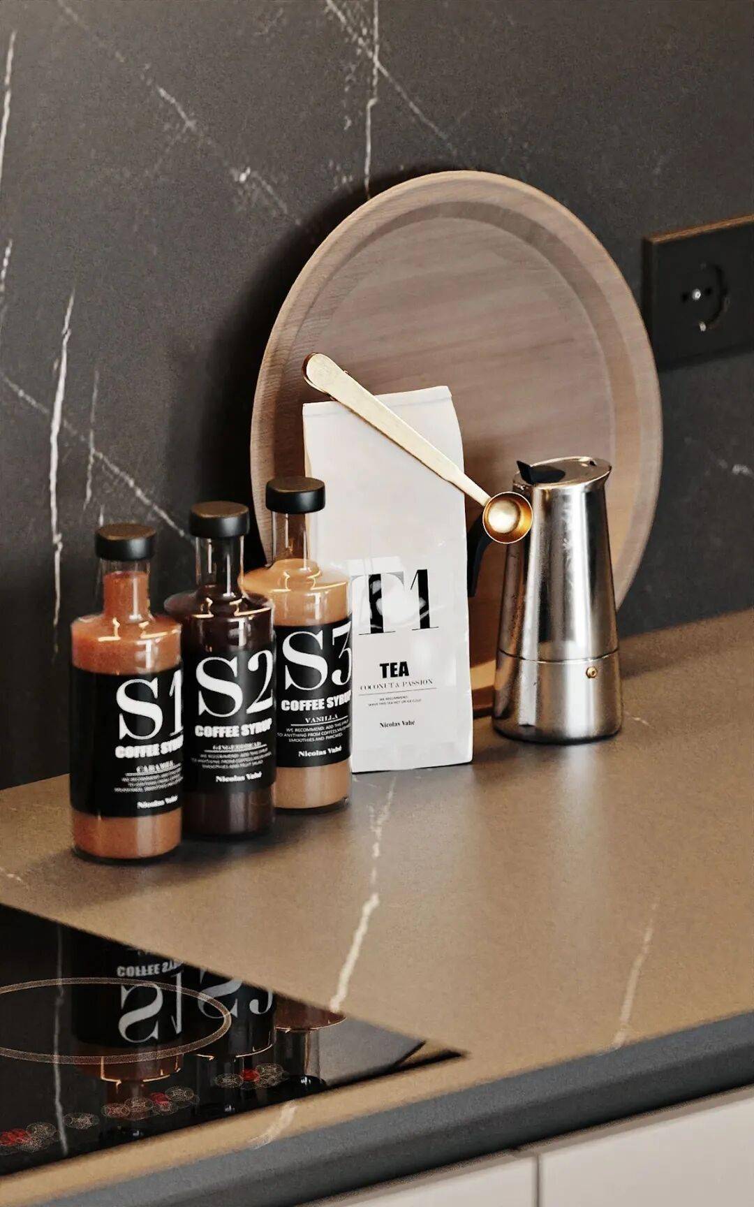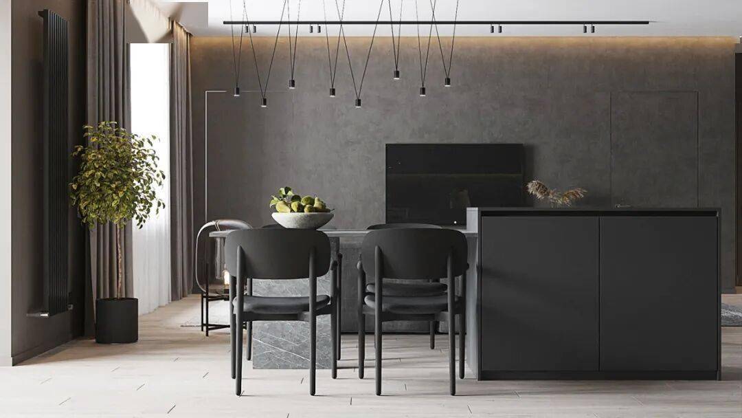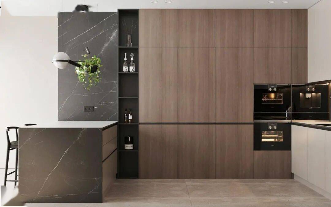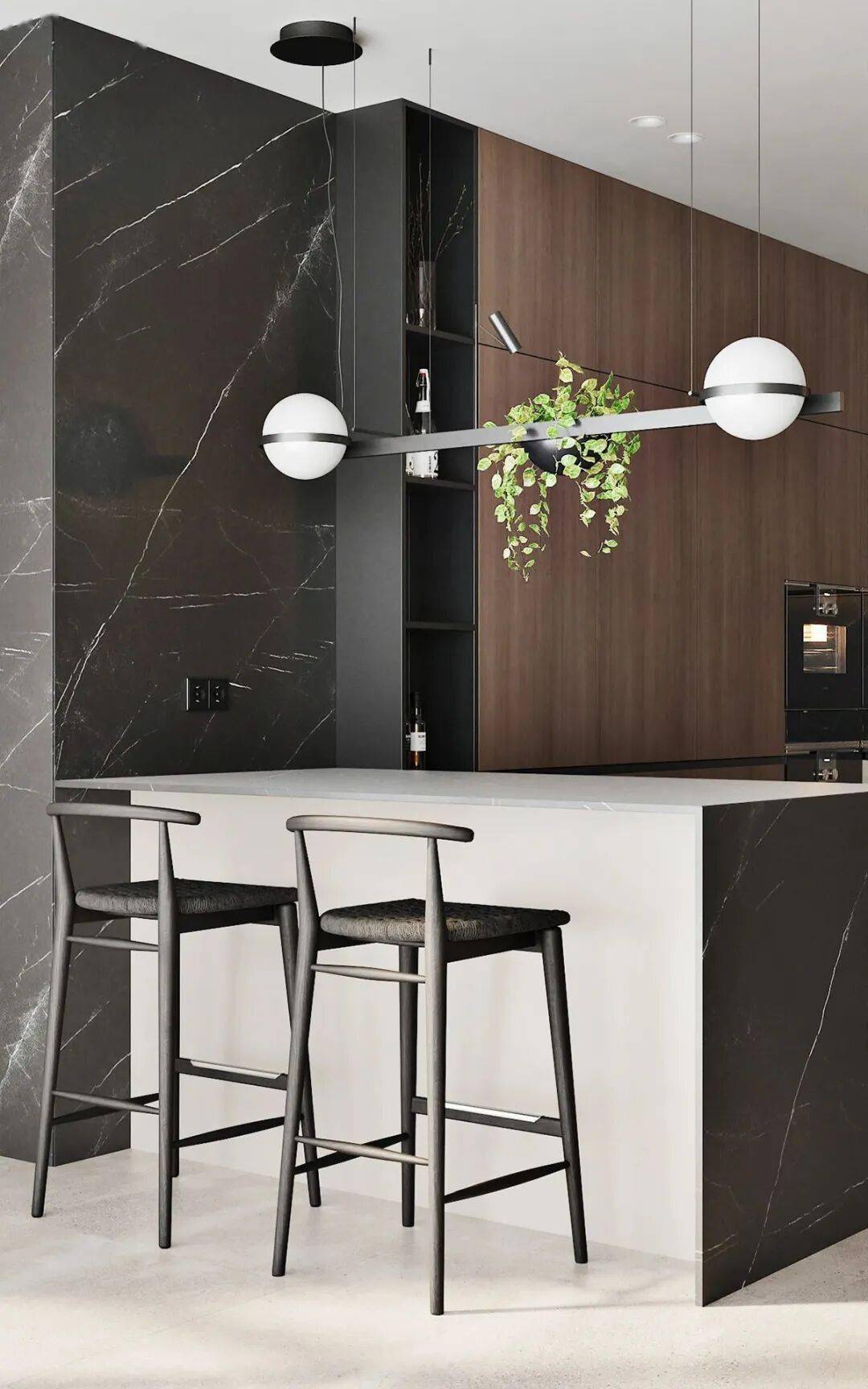 餐厅的后侧则是厨房,深木色的橱柜占满了整面墙搭配深色的大理石纹,沉稳而大气。厨房的操作区选用暖灰色饰面与黑色的大理石形成了鲜明的色彩对比。
