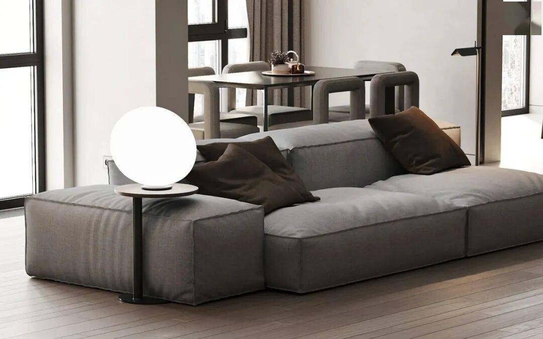客厅整体的布置简洁而舒适,半开放式的设计使得空间更加开阔,灰色石质的电视背景墙与灰色布艺沙发形成了色彩上的呼应,沙发旁的球形灯极简而富有设计感,暖调的实木地板与微黄的灯光,营造了温暖的空间氛围。墙壁的立体画则配合格栅,选择了中式风格。
