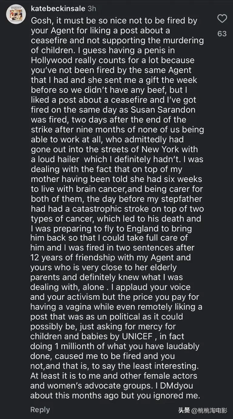 凯特透露,自己仅仅因为点赞了一条呼吁停火的帖子,就在2023年演员工会罢工结束后的第二天惨遭经纪人解雇,与奥斯卡影后苏珊·萨兰登被炒鱿鱼发生在同一天。