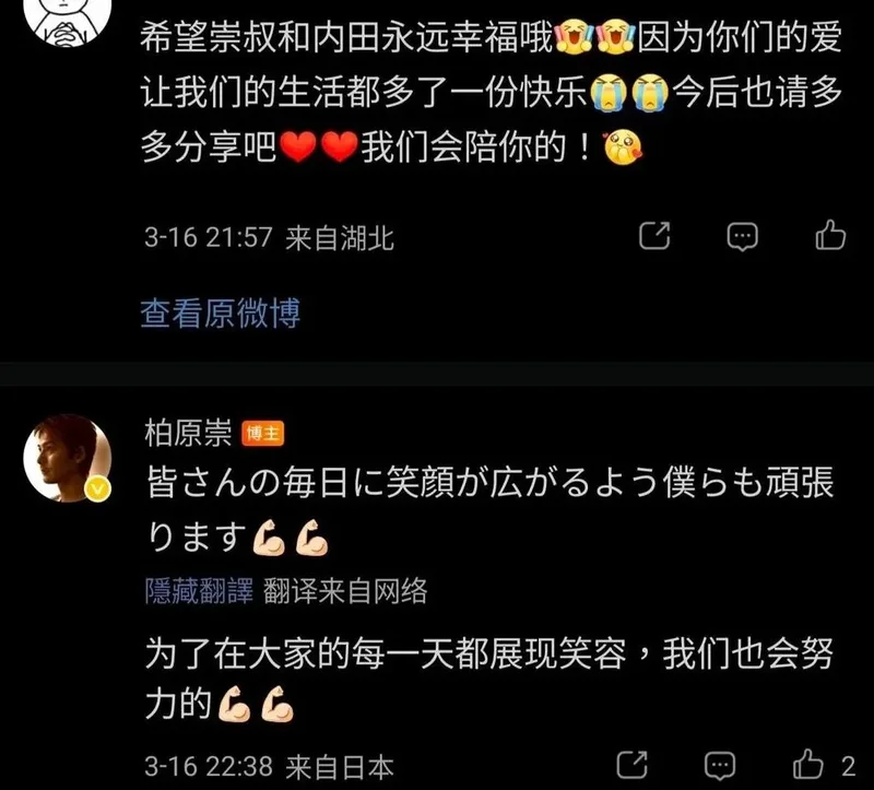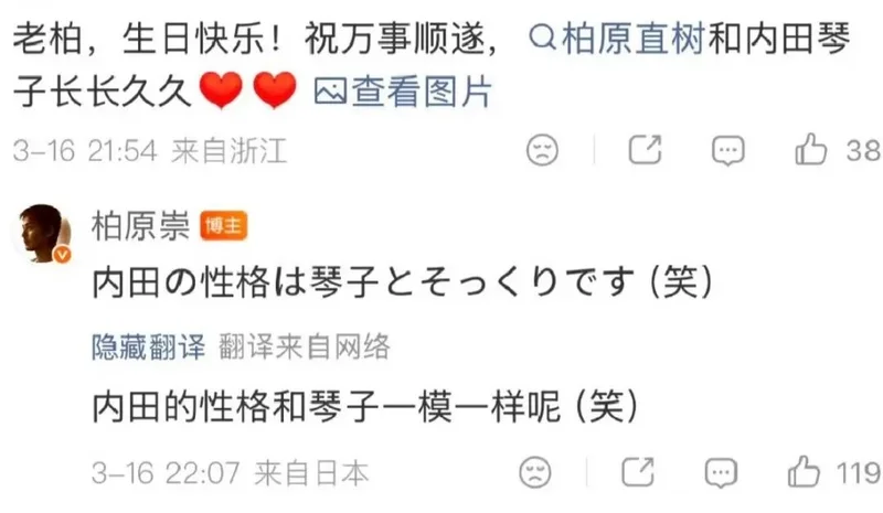 今年3月的时候,有网友在社媒上祝福柏原崇,还很可爱地把内田有纪称作内田琴子。