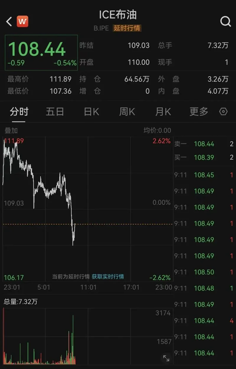 国际油价快速跳水。截至发稿,WTI原油期货跌1.81%,报109.52美元/桶;ICE布油期货跌0.54%,报108.44美元/桶。