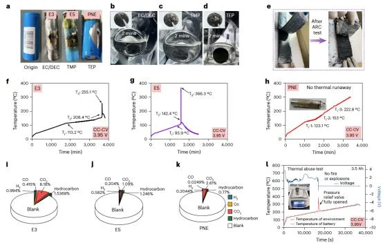 同时,基于磷酸三乙酯(TEP),在不可燃的基础上实现热致聚合,在高温下可快速固化形成隔断层,屏蔽正负极间的机械 / 化学串扰,彻底阻断电池热失控反应,成功实现安时级钠离子电池无热失控。
