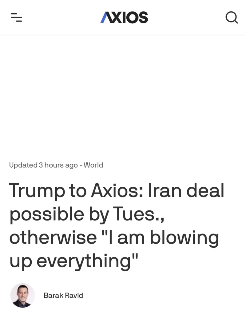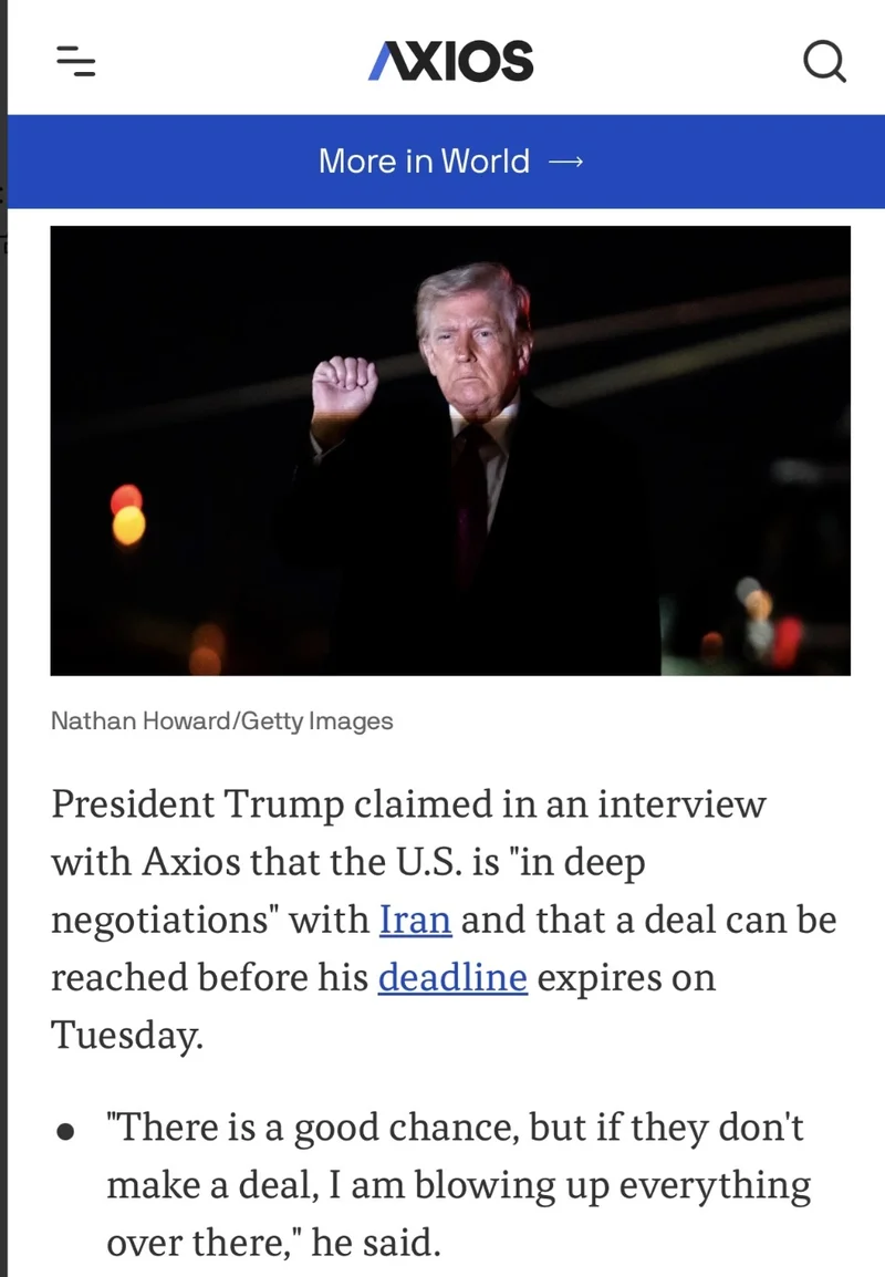 报道说,过去十天里,美国和伊朗通过巴基斯坦、埃及和土耳其进行了间接谈判,试图达成停火协议,以换取霍尔木兹海峡的开放。但尚未取得任何重大进展。周日早上,在接受Axios电话采访前不久,特朗普威胁称,如果伊朗政权不开放霍尔木兹海峡,将从周二开始轰炸伊朗的发电厂和桥梁。