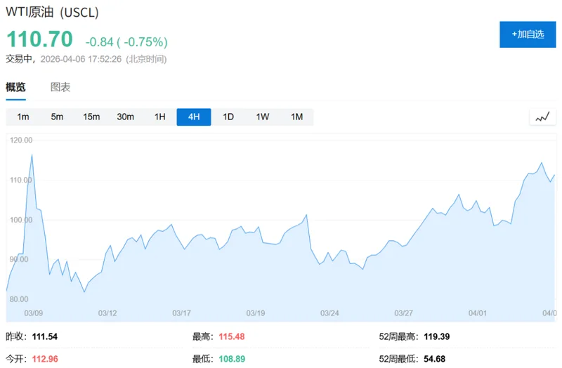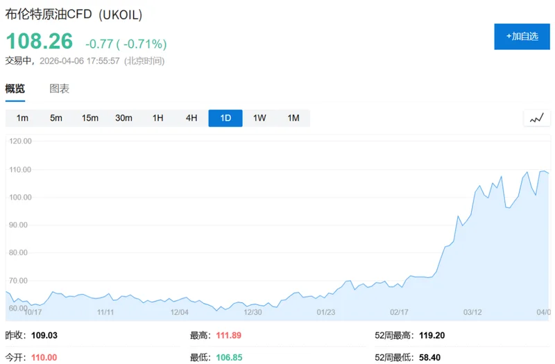 布伦特原油价格周一飙升至每桶109.77美元,较2月28日战争爆发时上涨约50%。美国西德克萨斯中质原油涨幅更高达66%,截至美东时间晚11时报111.2美元。