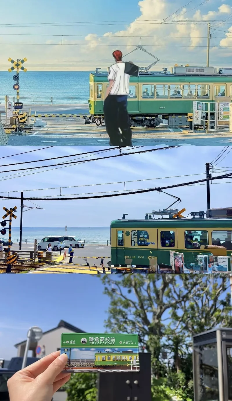 车窗外,是一望无际的海。风吹起浪花,也吹乱了思绪。电车经过镰仓高校前站时,铃声清脆响起,像极了灌篮高手里的某个瞬间。
