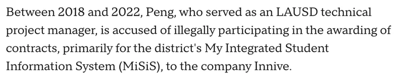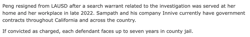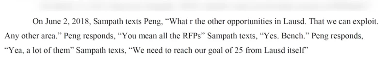 然而,根据洛杉矶县检察官内森·霍克曼(Nathan Hochman)提交的起诉书,自2018年至2022年间,Peng与德克萨斯州科技公司 Innive 的所有者高塔姆·桑帕特(Gautham Sampath)达成了一项隐秘的“权钱交易”协议。