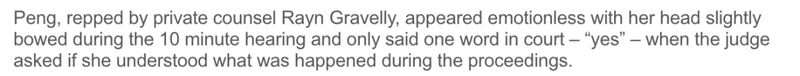 Peng由私人律师雷恩·格拉维利代理,在10分钟的听证会中显得面无表情,微微低头,在法庭上仅说了一个字——“是的”——当法官问她是否理解庭审过程中发生的事情时。