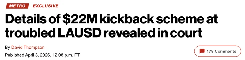 洛杉矶联合学区(LAUSD)近日爆发历史上规模最大的廉政丑闻之一。