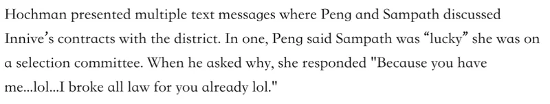 这起庞大的腐败案最早在2022年露出端倪。当时,一名学区 IT 员工在参加专业会议时,从一名以前的同事处意外获悉了Peng与桑帕特之间不寻常的私人联系。