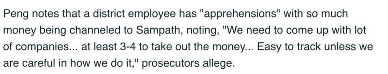 甚至当内部审查初露端倪时,Peng还曾发短信提醒Sampath:学区已有一名员工对庞大的资金流向表示“担忧”,并提醒Sampath:“我们需要更多的公司,至少3-4家去取钱,不然很容易被追踪”。