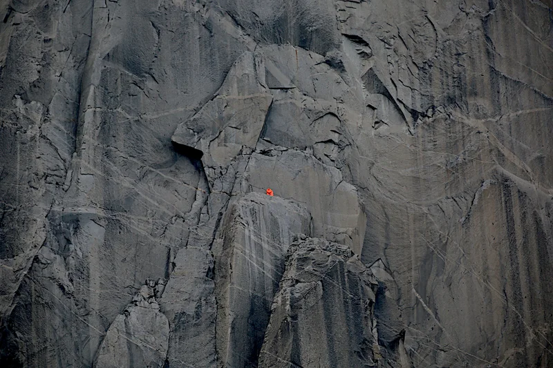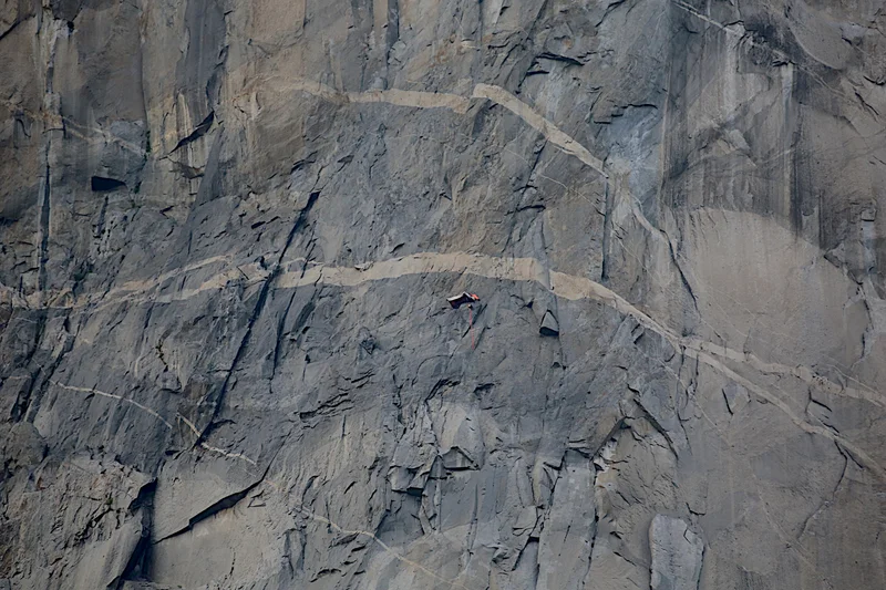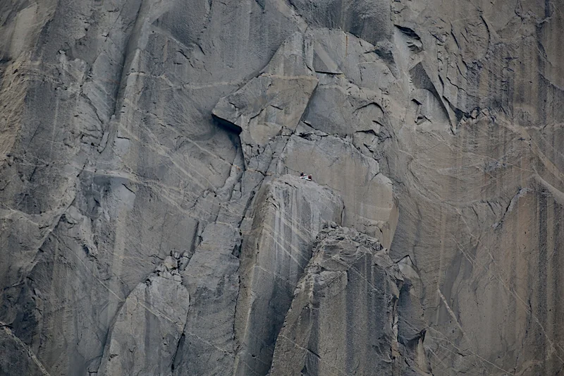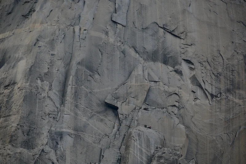 几年前的四月,我们去了优胜美地国家公园,并花了一些时间寻找攀登酋长岩的攀岩者。在默塞德河的对岸,仅凭肉眼很难找到攀岩者, 我们用望远镜搜寻攀岩者,随后拍下了照片。我们发现了两组攀岩者。其中一组似乎刚睡醒,正在收拾行装。
