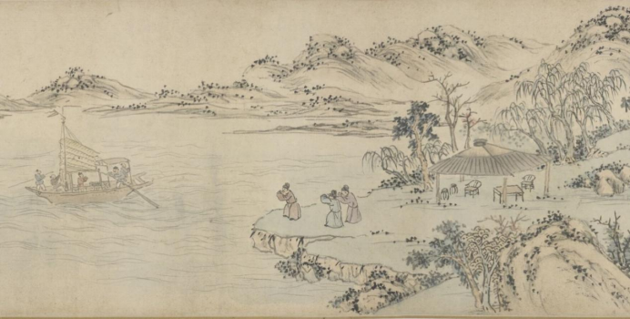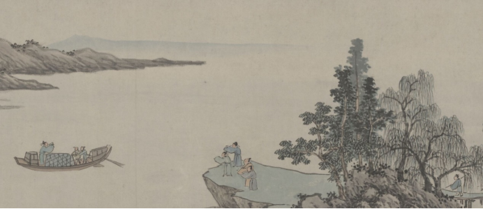 明代画家沈周画有一幅《京口送别图卷》,该画所描绘的是沈周送别好友吴愈前往叙州赴任的场景。画面颇为简洁,远处青山如黛,江波浩渺,柳树盈岸,柳树下几人正揖手向江中乘小舟离开的行人告别,舟中的行人也俯身回礼。江面浩荡,唯有一舟,略显孤独。作者将柳树置于画面的核心,其寓意不言而喻。
