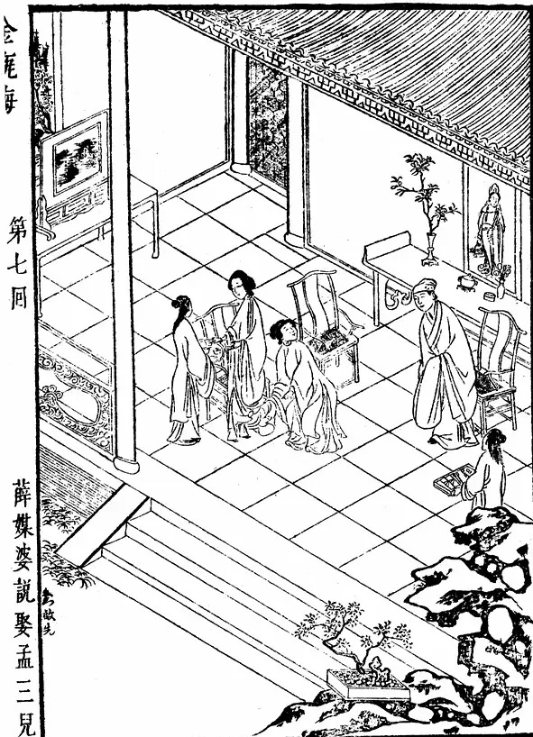 第七回:媒人薛嫂寻寻觅觅,为西门庆找到臭水沟住的富孀孟三姐。二人见面互相称心满意。西门庆重金收买杨家姑姑,力主再嫁西门庆。杨家娘舅张四欲谋些钱财,执意阻拦,岂不知坏了杨家姑娘如意算盘。二人在众邻居面前互相对骂,姑姑得胜。孟三姐顺利嫁入西门府邸。