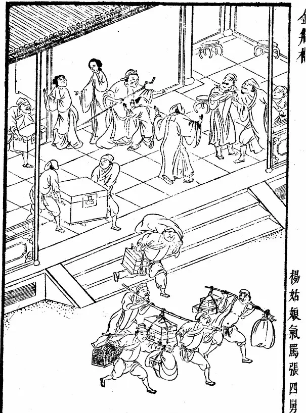 到二十四日,西门庆行了礼。二十六日,请十二位素僧念经烧灵,都是她姑娘一力张主。张四到妇人将起身头一日,请了几位街坊众邻,来和妇人说话。此时薛嫂正引着西门庆家小厮伴当,并守备府里讨的一二十名军牢,进来搬抬妇人床帐、嫁妆箱笼。被张四拦住说道:“保山且休抬!有话讲。”一面同了街坊邻舍进来见妇人。坐下,张四道:“列位高邻听着:大娘子在这里,不该我张龙说,你家男子汉杨宗锡与你这小叔杨宗保,都是我甥。今日不幸大外甥死了,白挣一场钱。争奈第二个外甥杨宗保年幼,是你男子汉一母同胞所生,莫不家当没他的份儿?只把你箱笼打开,同众人看一看,有东西没东西,大家见个明白。”妇人听言,一面哭起来,说道:“众位听着,你老人家差矣!奴不是歹意谋死了男子汉,今日添羞脸又嫁人。他手里有钱没钱,人所共知,就是积攒了几两银子,都使在这房子上。房子我没带去,都留与小叔。家活等件,分毫不动。就是外边有三四百两银子欠账,文书合同已都交与你老人家,陆续讨来家中盘缠。再有甚么银两来?”张四道:“你没银两也罢。如今只对着众位打开箱笼看一看。就有,你还拿了去,我又不要你的。”妇人道:“莫不奴的鞋脚也要瞧不成?”