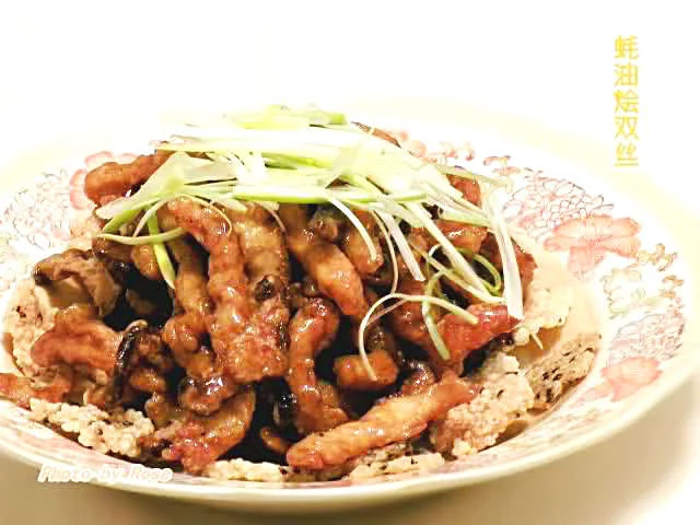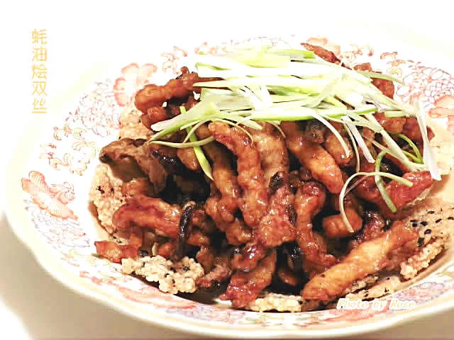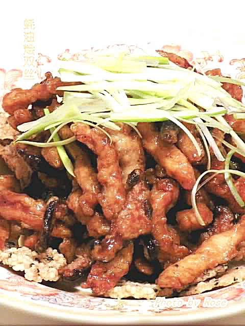六、倒入炸过的肉丝和冬菇丝,收小火,快速翻拌均匀,熄火,将肉丝和冬菇丝铺在锅巴上,再淋入锅里的汁,面上铺上葱丝。