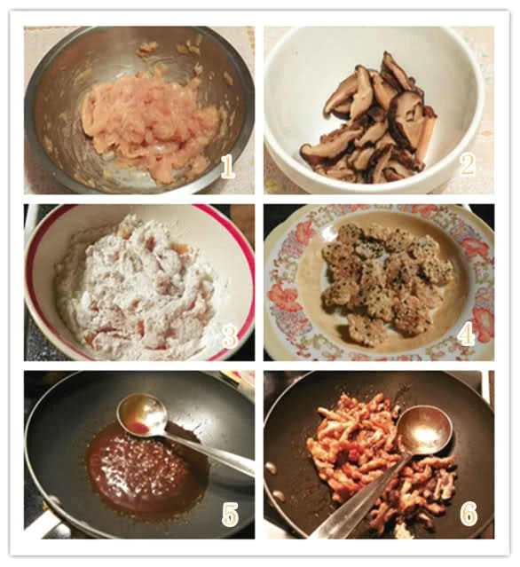 三、将肉丝和冬菇丝沾满玉米淀粉,炸时记得要抖一抖多余的粉,4-5成油热,炸至金黄色,捞起滤油;