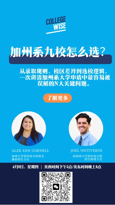 这也是为什么,4 月 9 日这场 Collegewise 的 UC 专题讲座,值得每一个关心加州大学申请的家庭认真听完。、